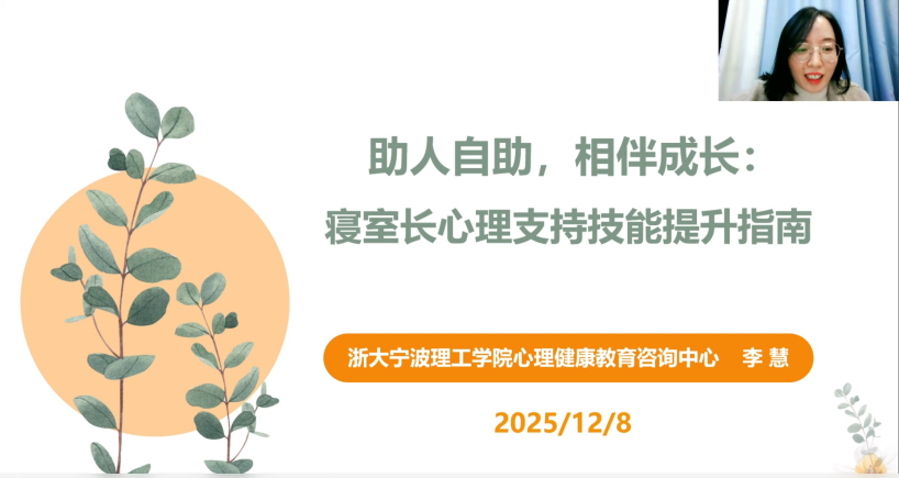 为进一步完善学校心理健康教育四级网络体系,将心理育人工作切实深入学生生活基本单元,提升寝室长的心理支持技能,实现“助人自助”,共建和谐平安校园,12月8日晚,心理健康教育咨询中心组织开展了寝室长心理专题培训。本次培训由心理中心李慧老师担任主讲,各学院相关负责人、2025级全体寝室长及其他年级新当选寝室长参加。