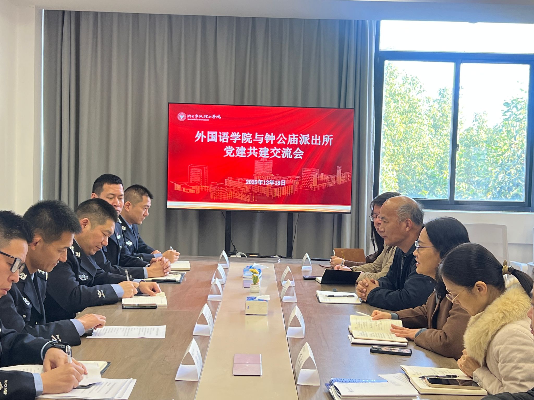 当日,外国语学院还和钟公庙派出所开展党建联建活动,双方围绕反诈宣传教育、学生实习实践、涉外服务支持等方面展开深入交流,派出所为学院带来了量身定制的安全法制课堂,也带来了校地合作的丰富资源;学院发挥自身的人力资源优势和专业特长在志愿服务、涉外交流等方面提供支持;双方就安全文化育人达成共识并提出具体举措。