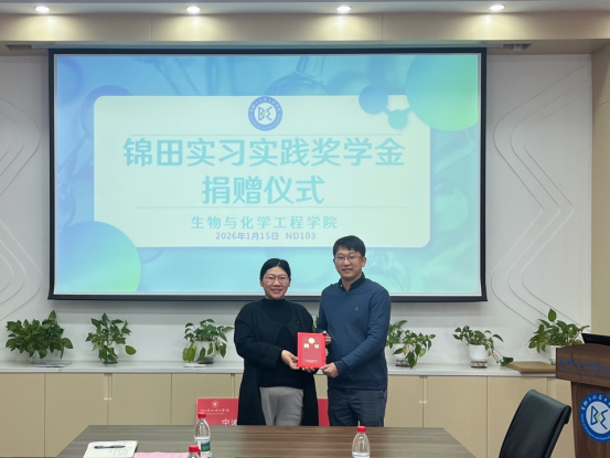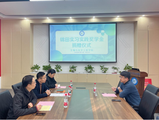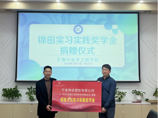为感谢企业支持并深化合作,1月15日,生化学院举办“锦田实习实践奖学金”捐赠授牌仪式,宁波锦田塑胶有限公司总经理郑晨,生化学院相关负责人参加活动,见证校企合作的深化发展。
