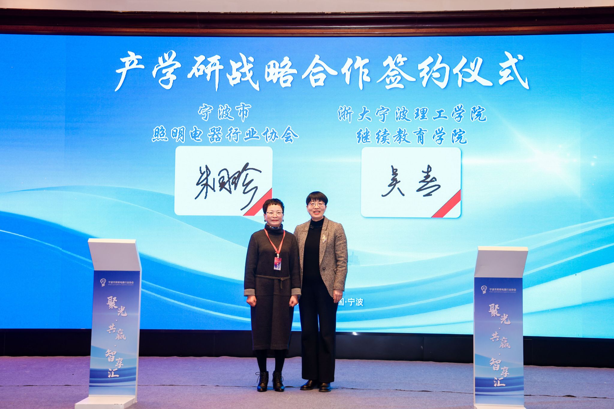 作为双方代表,宁波市照明电器行业协会会长朱国珍与浙大宁波理工学院继续教育学院院长吴春正式签署《校协合作赋能战略合作协议》。