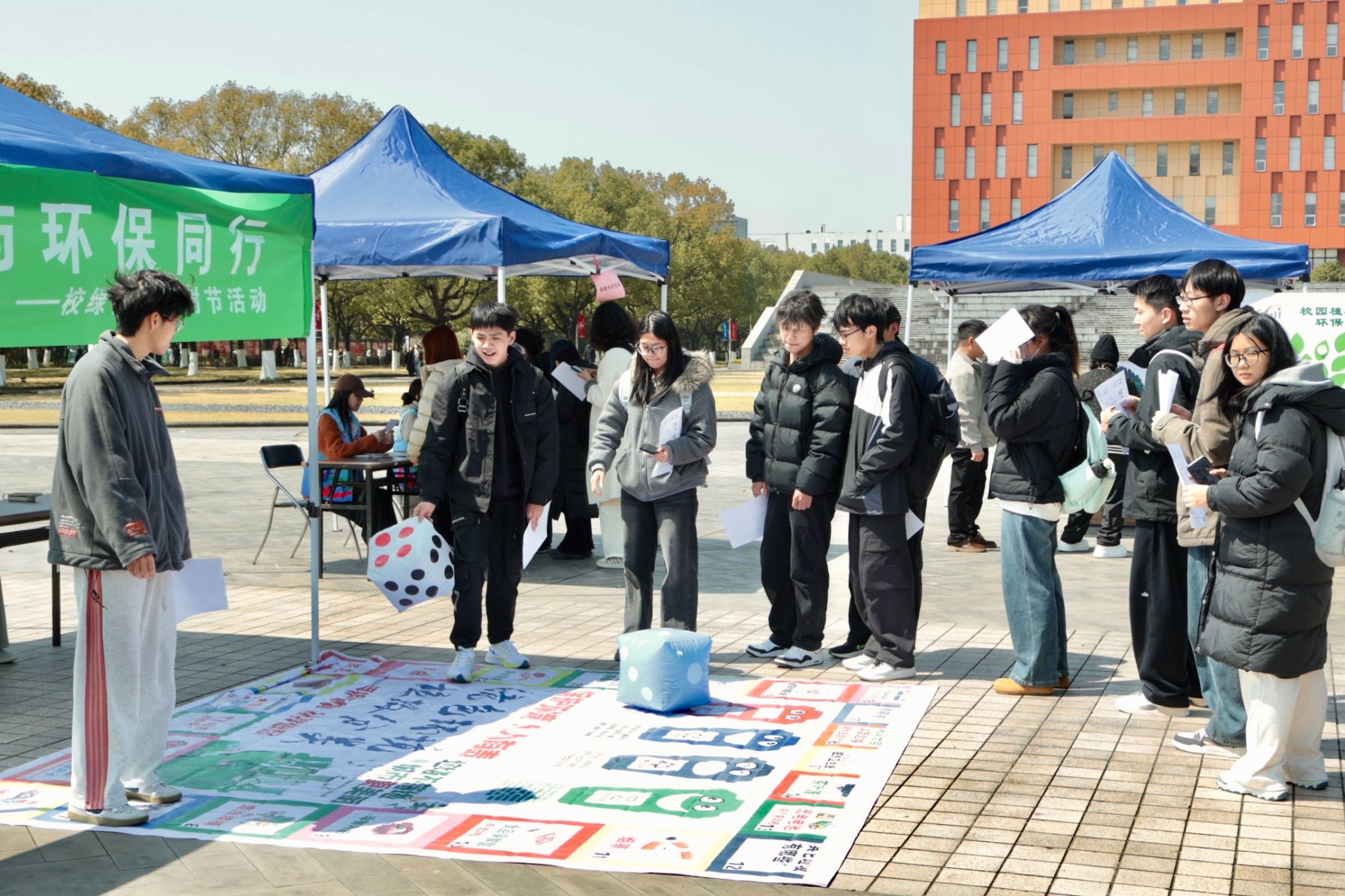 垃圾分类的巨型棋盘上,两人一组通过掷骰子回答分类问题,双方激烈竞答,寸步不让,在欢声笑语中厘清了易混淆的垃圾分类规则。
