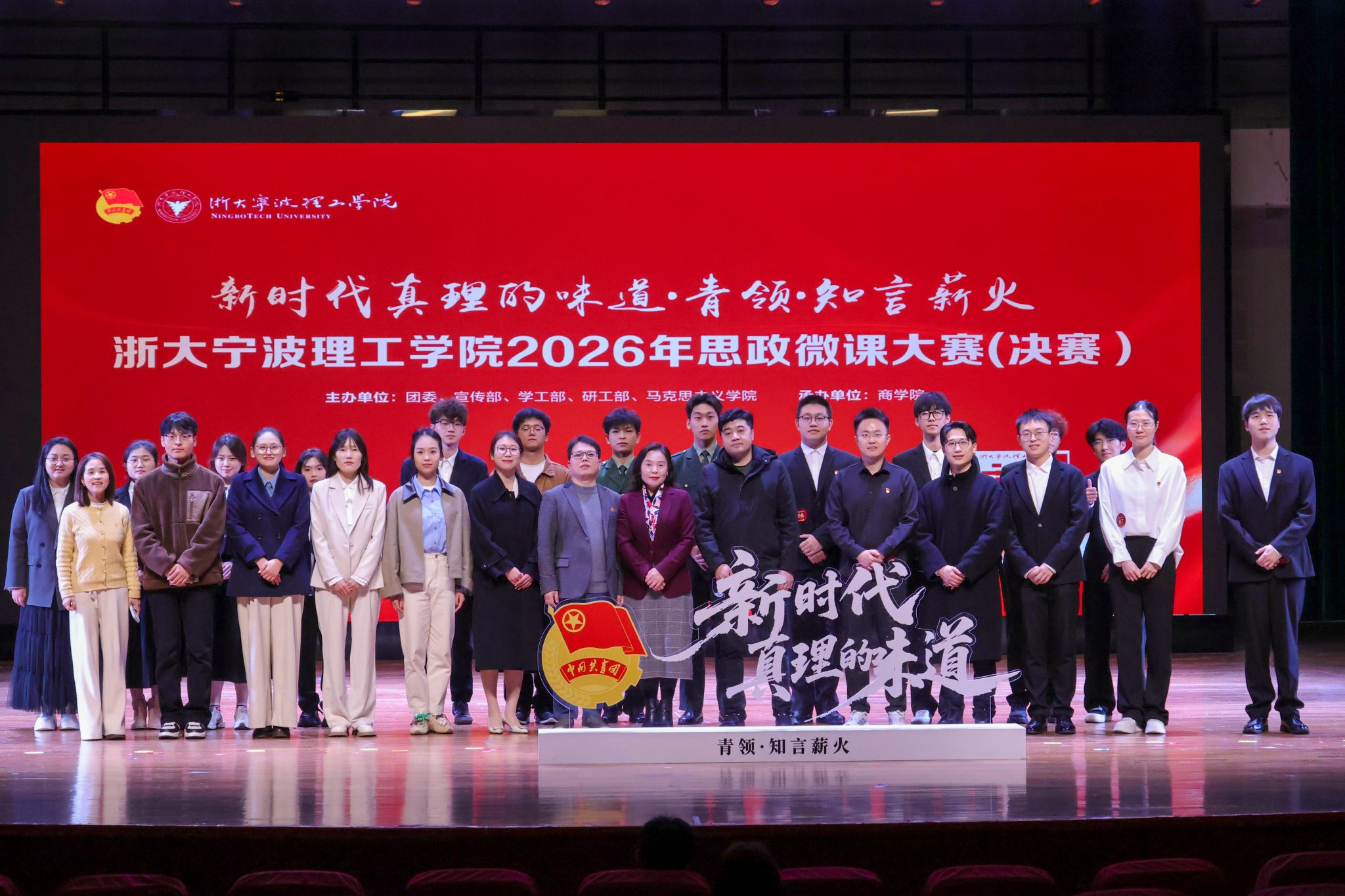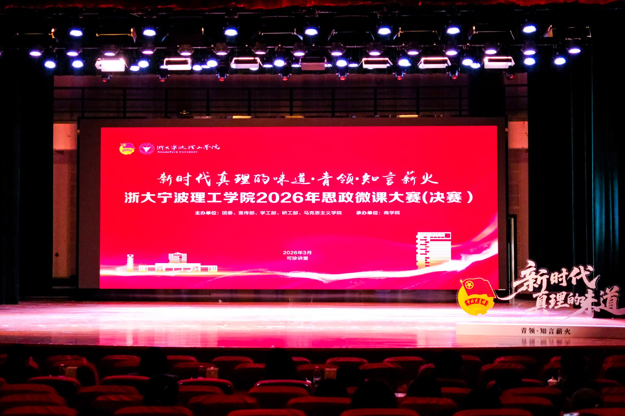 为全面贯彻党的二十大和二十届历次全会精神,深入贯彻落实习近平总书记致全国青联十四届全委会和全国学联二十八大的贺信精神,立足“十五五”规划开局之年的新起点,进一步引导青年学子自觉听从党和人民召唤,坚定理想信念,厚植家国情怀,勇担历史使命,奋力书写挺膺担当的青春篇章,3月27日下午,由团委、宣传部、学工部、研工部、马克思主义学院主办,商学院承办的“新时代真理的味道·青领·知言薪火”2026年学校思政微课大赛在可珍讲堂举行。宁波财经学院马克思主义学院副院长、党委副书记姜帆,鄞州区党校教研室副主任高瑶瑶,学校学工部、研究生处、教务处、马克思主义学院相关负责人担任比赛评委。