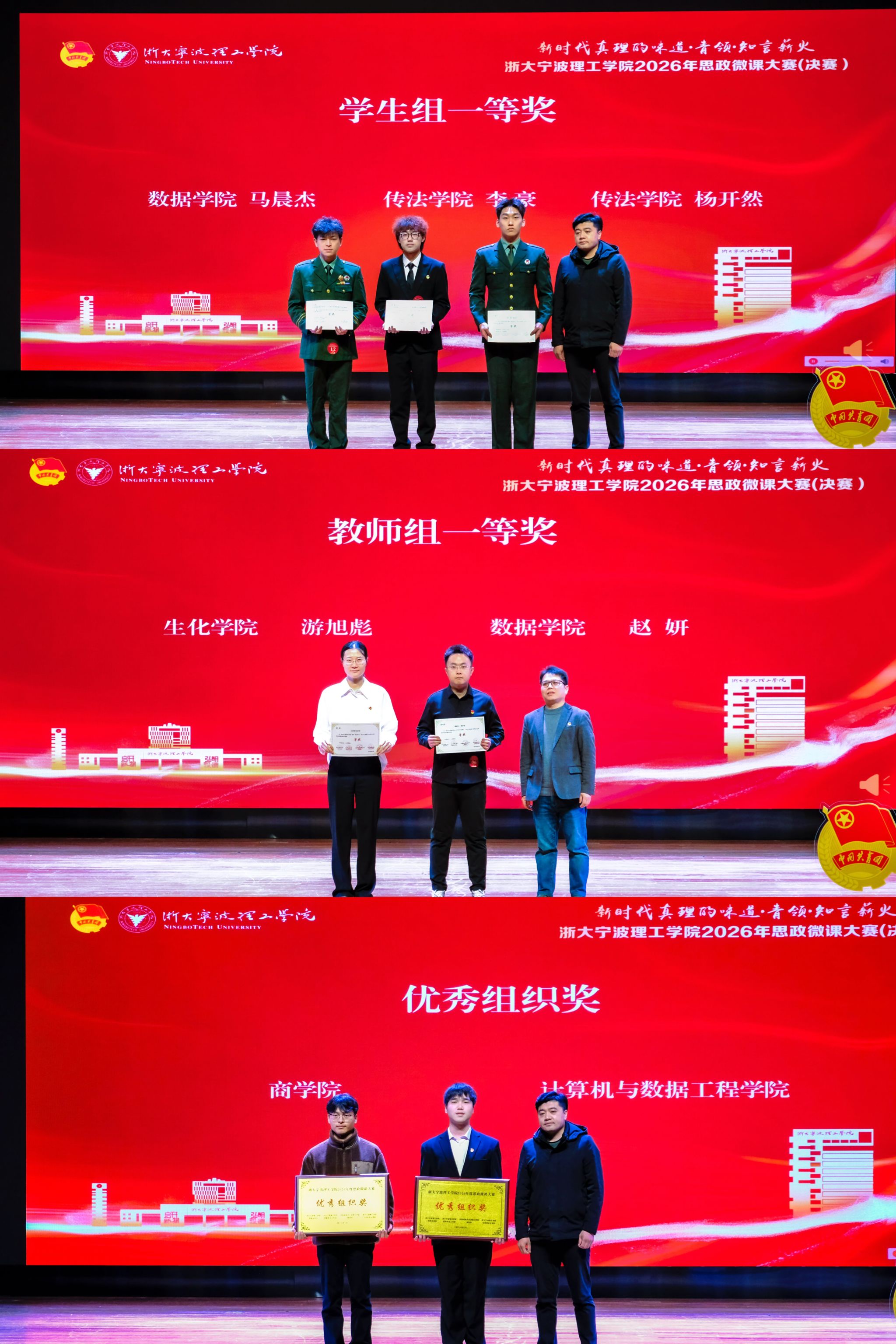 本次思政微课大赛既是一次思想碰撞的青春盛会,也是一次初心使命的生动实践,充分展现了我校师生昂扬向上的精神风貌。下一步,学校将进一步扩大赛事成效,深化“青领”品牌建设,将大赛成果转化为“青领团课”鲜活教材,融入“青领·知言薪火”宣讲团巡回宣讲,让精品微课进班团支部、进社团、进学生组织,引导广大团员青年在中国式现代化的伟大征程中挺膺担当,为学校加快建设具有“港城特色、浙大底色、理工本色”的一流创新性应用型大学贡献青春力量。