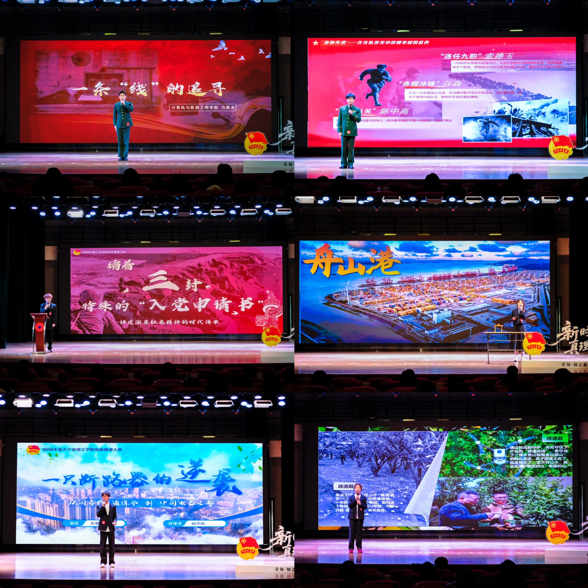 10位教师组选手各展所长,以“理论+案例”的生动形式,将抽象思政理念转化为可听可感、可学可用的鲜活课堂。将抽象思政理念转化为可听可感、可学可用的鲜活课堂。王聪聪聚焦人工智能赋能浙江实践,展现科技驱动区域发展的强劲动力;章立昀以甬港联动为脉络,讲述城市协同的时代新篇;洪茹菲深挖两江红色资源,让红色血脉成为铸魂育人的精神养分;庄锦前赓续长征精神,赋予其新的时代内涵;陈可从三片水域切入,解读浙江共富的实践密码;游旭彪以“那盏灯,那条路”讲述红色故事,传递信仰力量;赵妍用“山的那边是海”诠释红色精神的绵延与感召;张溶溶解码浙江“千万工程”的共富实践密码,剖析其实践内涵与共富价值;刘思锶从体育赛场视角,讲述浙江共富的多元答卷;刘娟以“守根·闯海”为题,诠释家国情怀的生生不息。