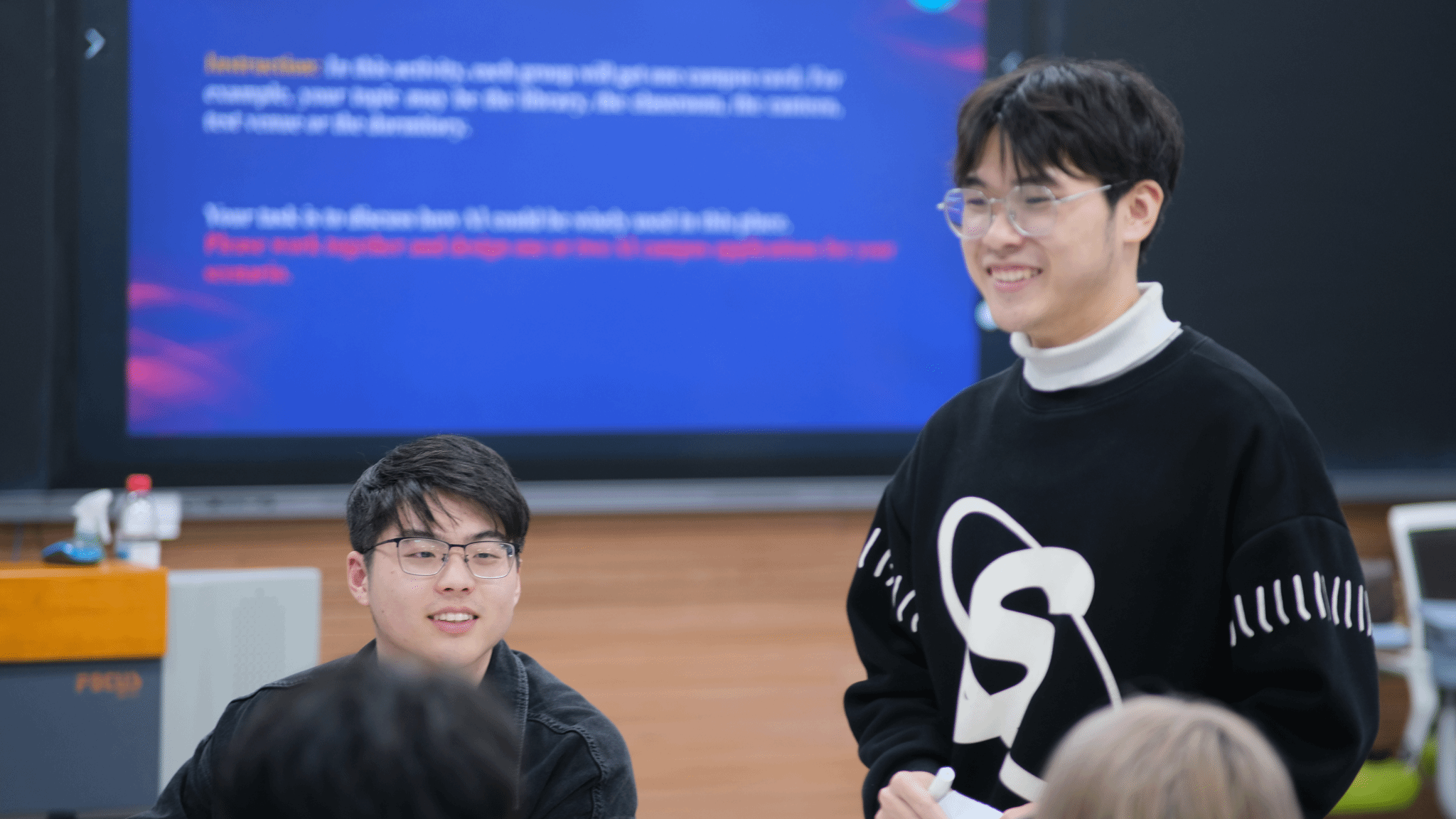 在情景创作环节“AI in Our Daily Life”中,同学们分组抽取了图书馆、课堂、食堂、考场、宿舍等校园场景卡片,化身“校园创新设计师”,围绕各类场景构思AI应用方案。“AI图书馆智能检索与书籍推荐系统”、“课堂AI个性化学习辅导助手”、“食堂AI营养分析与智能取餐规划”等创意方案层出不穷,兼具想象力与实用性,充分展现了同学们的语言组织能力与创新思维。