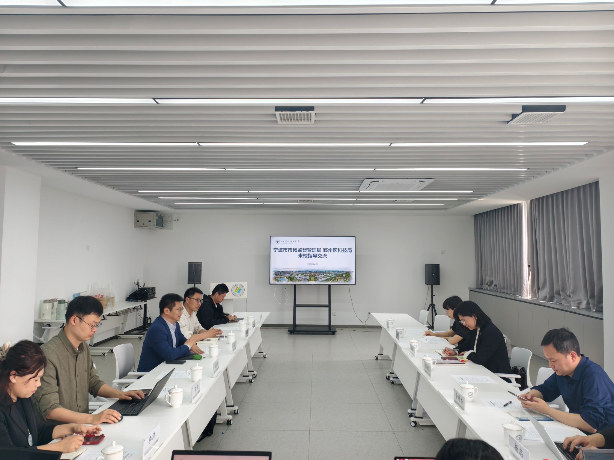 2026年4月9日,宁波市市场监督管理局和鄞州区科技局来访,围绕宁波构建以数据可信、合规、可追溯为核心的现代服务业生态体系展开研讨。宁波市市场监督管理局小微企业发展处处长金琳、小微企业发展处四级调研员任流,鄞州区科技局党组成员顾世东,宁波泉铭科技服务有限公司、宁波国际物流发展股份有限公司负责人,我校科研处、信息中心、创新创业教育中心、商学院、宁波经理学院相关负责人参加会议。
