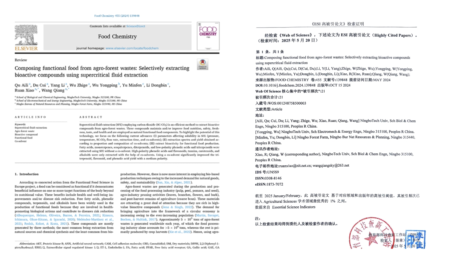 近日,经Web of Science最新统计,生化学院植物化学创新团队发表题为“Composing functional food from agro-forest wastes: Selectively extracting bioactive compounds using supercritical fluid extraction”的研究论文,被识别为Essential Science Indicators高被引论文,该论文于2024年在《Food Chemistry》上发表,通讯作者为王强教授、阮晓副教授,第一作者为曲爱丽博士,第三作者为杨丽博士。
