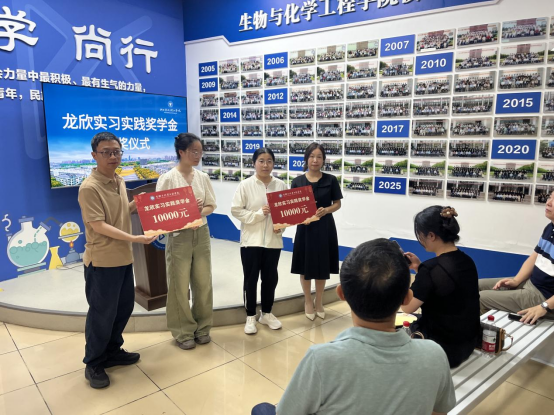 随后,现场举办“龙欣实习实践奖学金”颁奖仪式,此项目2024年成立,由龙欣集团在学院设立20万实习实践奖学金,今年第一届共6名学生已顺利完成实习,学院生物工程系主任胡升和企业代表谷灿波向学生代表邱雨欣(化工213)、夏智贤(化工专升本231)颁发奖学金。