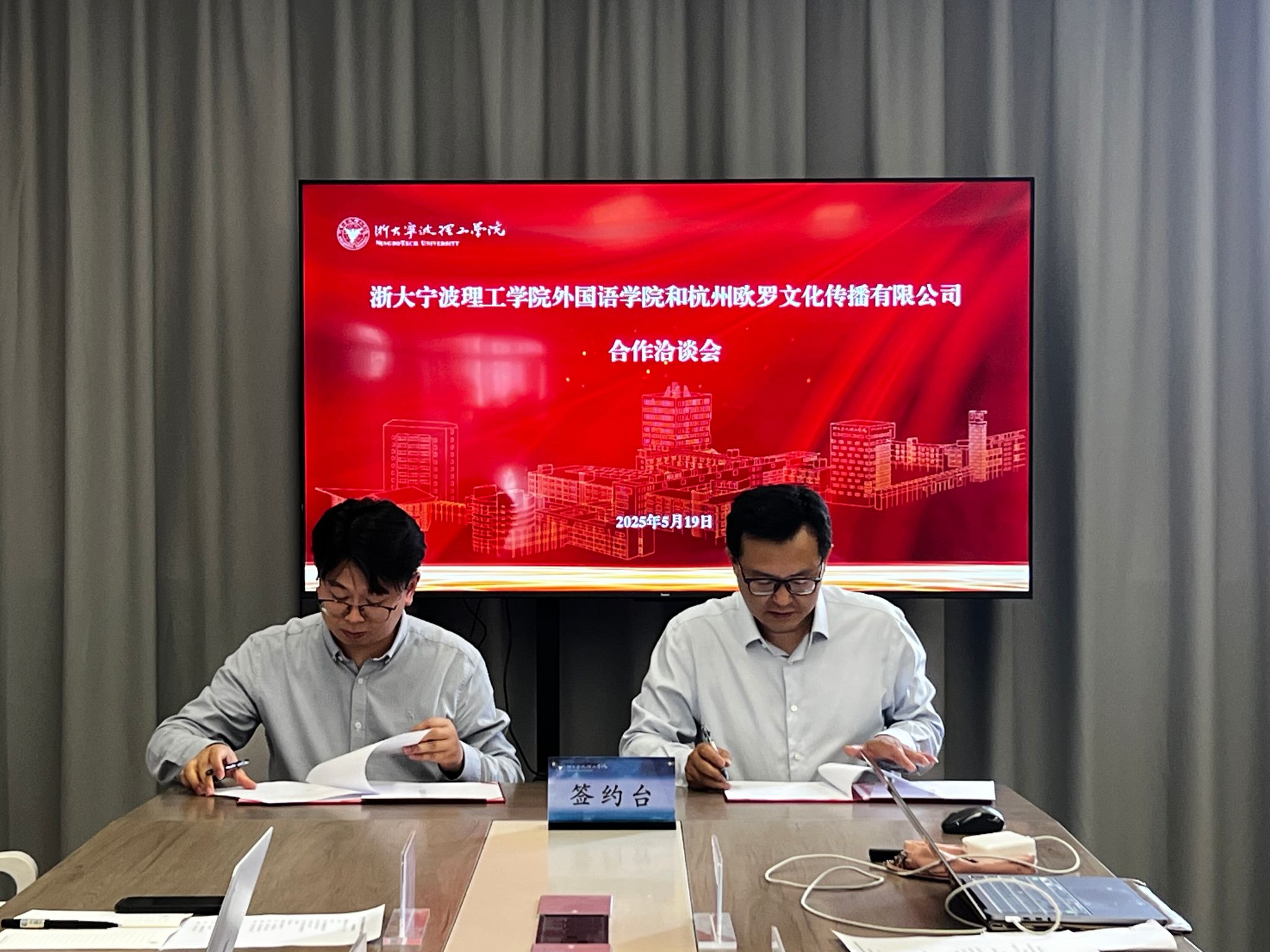 2025年5月19日,学校外国语学院与杭州欧罗文化传播有限公司在学院SC408会议室举行全球胜任力培养合作暨就业实践实习基地签约仪式。外国语学院执行院长蔡亮发言并授牌,杭州欧罗文化传播有限公司总经理朱烜等参加本次仪式。