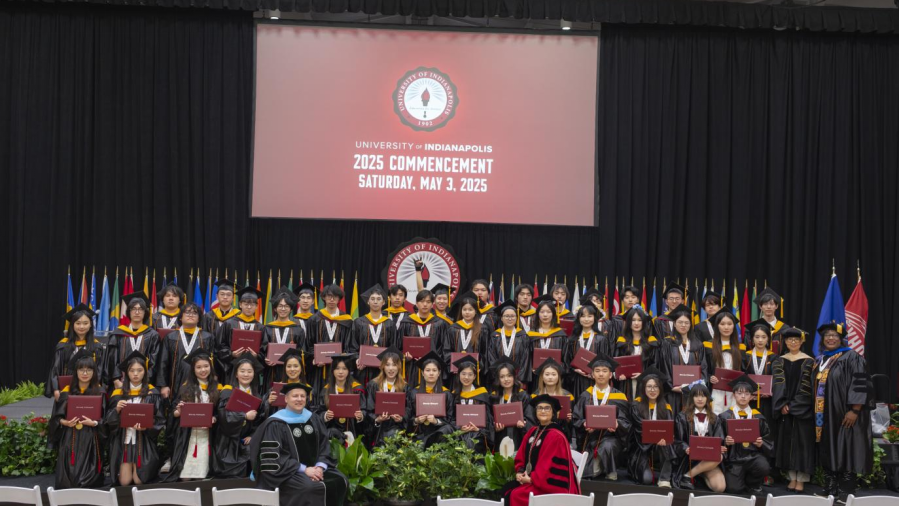 印第安纳波利斯大学校长Tanuja Singh博士,副校长Chris Plouff博士在毕业典礼上与中美班同学的合影