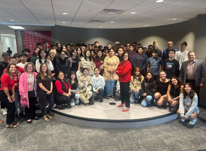 21级中美班学生参加迎新活动,与印第安纳波利斯大学校长Tanuja Singh博士,副校长Chris Plouff博士合影