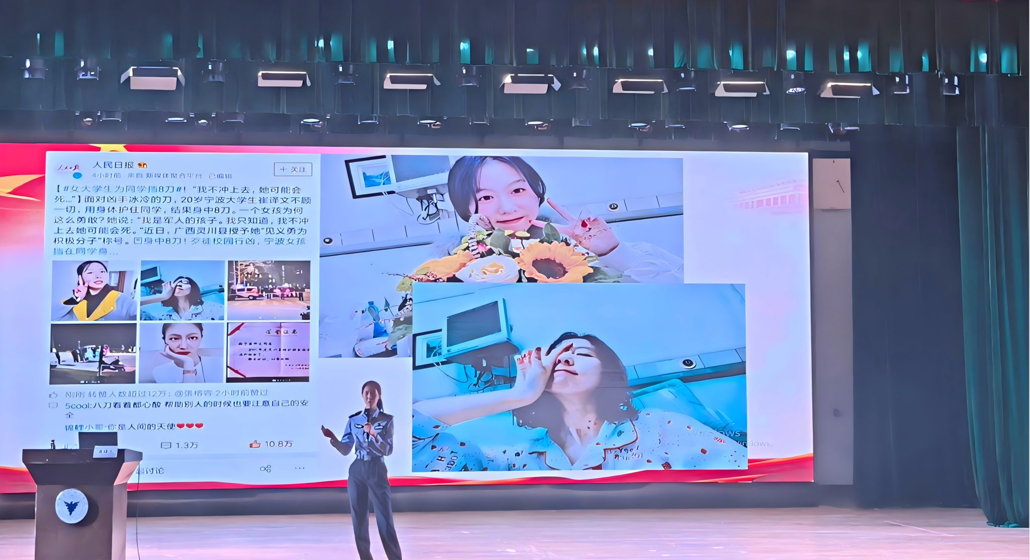 在课上,崔译文向大家讲述自己的青春故事。她的家庭曾获第二届全国文明家庭荣誉称号,作为军人的孩子,成长环境赋予了她善良勇敢的底色。2019年,面对歹徒行凶,她毫不犹豫地冲上前去,为同学挡下8刀,成为大家耳熟能详的“挡刀女孩”。然而鲜花掌声背后的她也曾经历过迷茫的大学时光,在一次颁奖典礼上幸遇很多优秀的人,榜样的力量指引她开启蜕变之旅。回到学校后,她开始积极参加各类比赛,不断提升自身能力;投身志愿服务,为抗击疫情贡献力量;担任亚运会火炬手,传递希望与梦想。2023年9月,崔译文成为一名光荣的基层派出所人民警察。她讲到,这不仅是她个人职业的选择,更是她对道德使命的进一步践行。从见义勇为的英雄到人民警察,她始终坚持把实现个人价值融入为社会、为人民服务的伟大事业中。