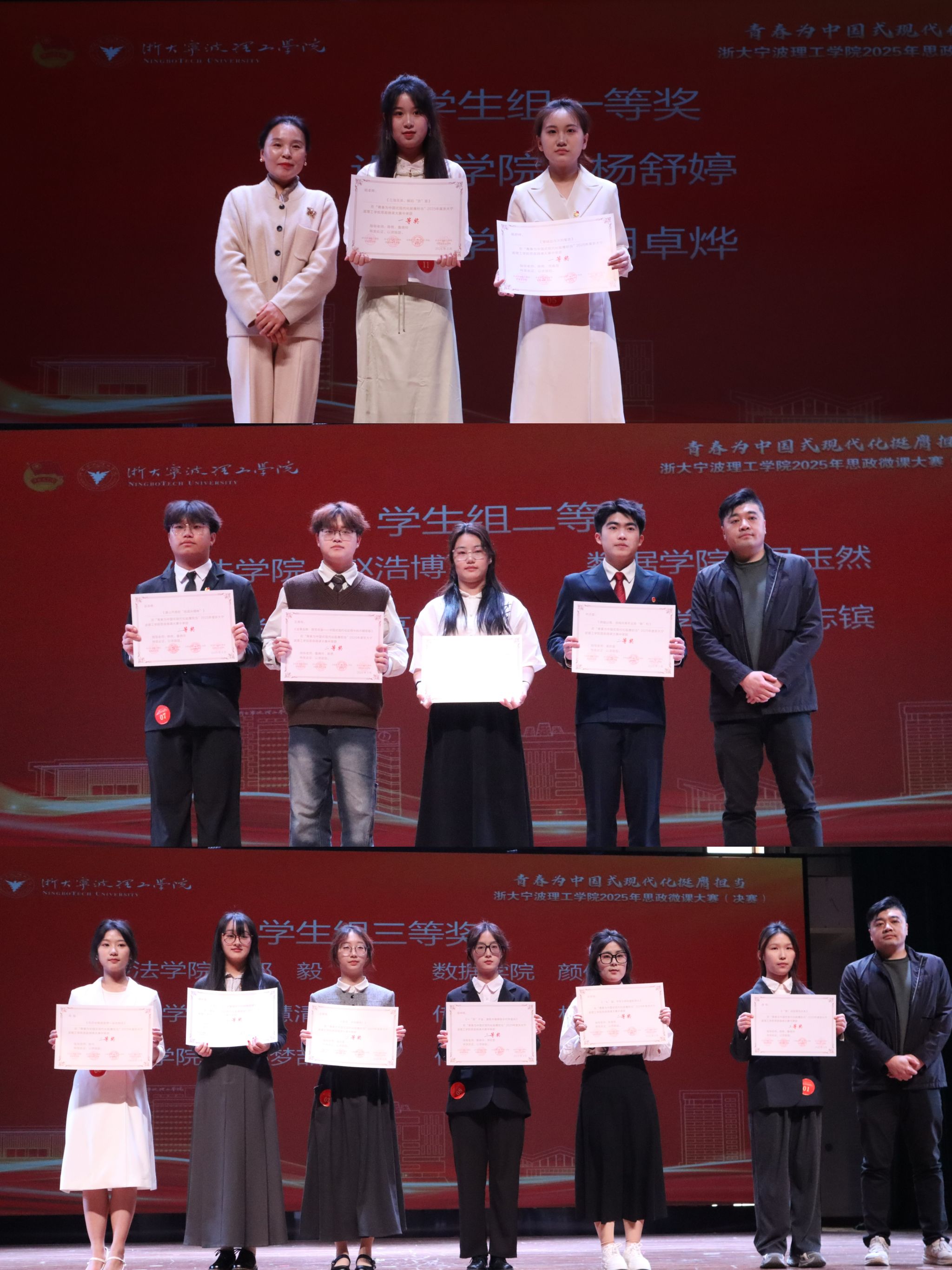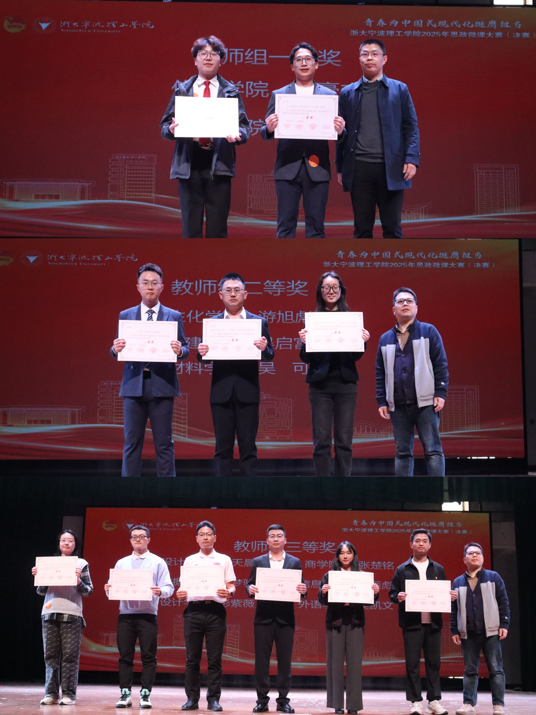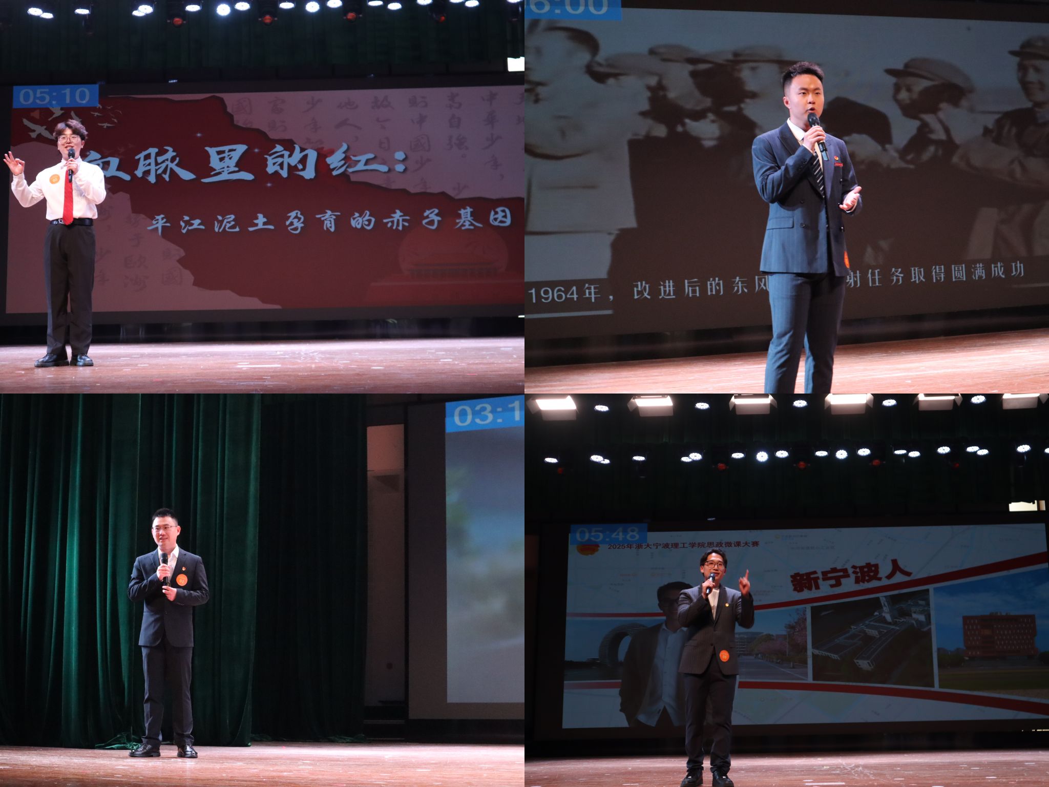11位参赛教师围绕发展成就、红色教育、青春力量等主题,以“多维视角+生动案例”诠释理论之光。吴启富以修路、兴业、育人为切入点,讲述“三路协同”绘就乡村共富新图景的实践;张梦驰结合“八八战略”,解读全民运动如何彰显“浙里人爱运动”风尚,并推动体育产业经济发展;游旭彪以顾方舟、余梦伦和屠呦呦为例,讲述了“甬”远闪耀的科学家精神是推进民族复兴的密钥;吴可基于八八战略的发展背景,讲述了义乌在此背景下的蝶变,从“无可奈何”到“无奇不有”;吴豪杰以牺牲、坚守、传承为关键词,表达了青年对家国的情怀;彭紫薇通过《哪吒2》,深度分析了其背后所蕴含的中国式创新;黄振彪从瓦爿墙到新丝路,介绍了宁波从古至今的发展;陈可以一个新宁波人的视角,以选择、融入、担当为切入点,详细阐述了宁波的发展和开放;樊凯文结合自己支教的亲身体验,阐述了红色根脉的传承与赓续;孙天晨以《哪吒2》为例,挖掘其背后所蕴含的传统文化;张楚铭以“让运动成为青春底色”为主题,从自己的健身经历,提出了浙青年,爱运动的育人方向。