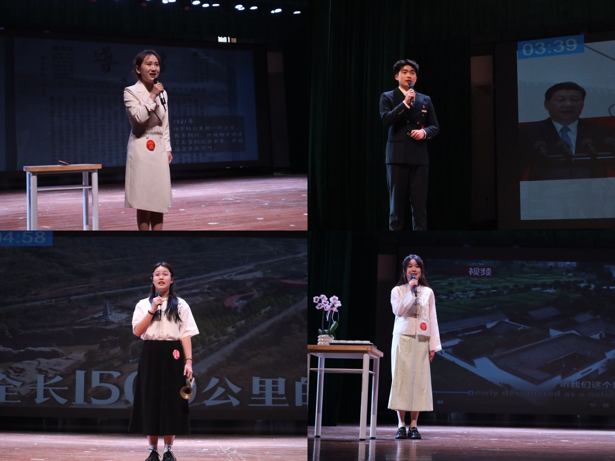 12位参赛学生结合三大赛道类型,将生活中的小故事融入微课设计中。郑毅以木棉花为关键词,借助父亲的事例,阐述了木棉花精神的独特性;杨梓萌围绕黄杨木雕这一非遗,以其为钥,解锁乡村共富码;马玉然从凿山者、领路者、赓续者三个角度,分析了伟大的红旗渠精神;赵浩然通过分享自己大伯的事迹,讲述了铁道兵精神在民族复兴路上的重要性;杨舒婷讲述了伟大的革命先烈刘英的故事,表示青年应坚定信仰之路,用青春之火创造青春之中国;谭晔用湖州农业的发展,引申出信息化发展对于农业发展具有重大的促进作用;叶志镔讲述了数智发展促进了太子参的种植发展,发现了农业新“参”机;王慧清通过龙广茂的故事,讲述了军号在新时代的重要意义;王高申以邢燕为例,展现了中国式现代化征程中的巾帼力量;颜依萱分享先辈的事迹,阐述了有理想、敢担当、能吃苦的铿锵玫瑰精神;胡卓烨以三泡玉茶,涤尘、回甘、凝香为钥,解密浙里茶叶发展;孙梦喆通过南孔圣地,有礼衢州为切入点,书写文明共富新荣光。