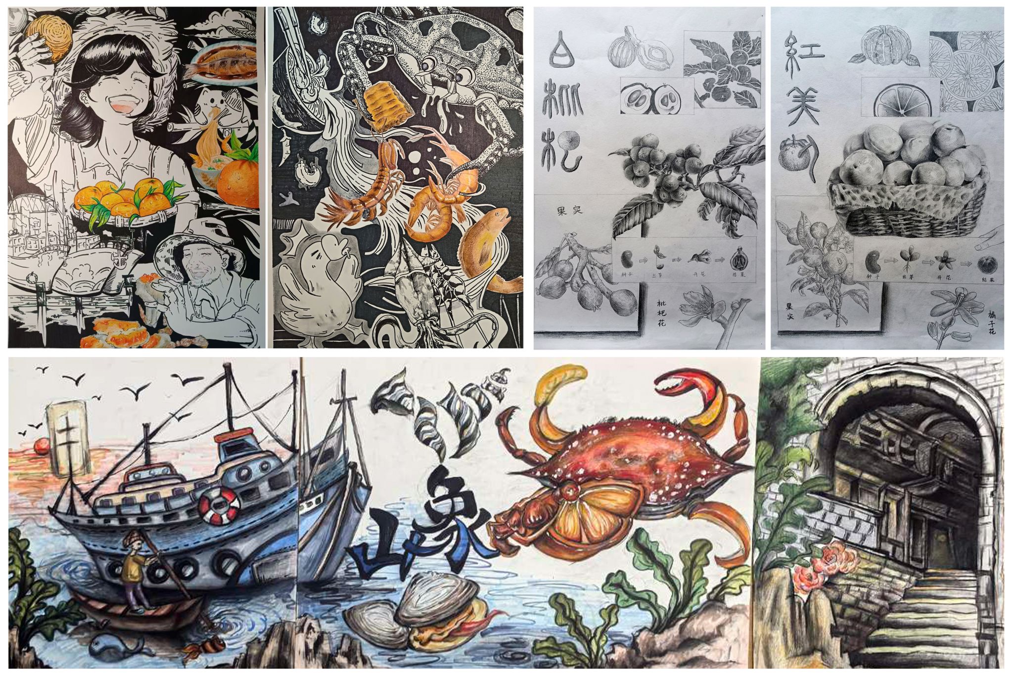 象山的美食也在同学们诙谐的笔下散发着诱人的气息:肥美的螃蟹、鲜嫩的鱼虾,还有金黄酥脆的米馒头等,每一个细节都妙趣横生。创作者们不仅展现了食物的外形,更通过光影的处理,传达出美食背后的文化底蕴。就像那盘螃蟹,坚硬的外壳、灵动的蟹脚,仿佛下一秒就会挥舞起来,让人不禁联想到象山渔民出海捕捞的场景,以及一家人围坐品尝海鲜的温馨画面。这些关于象山文化风情的素描作品,就像一个个窗口,邀请大家走进象山多姿多彩的世界,感受那份独特的人文风情与生活气息。