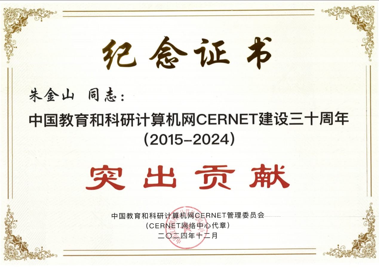 近日,中国教育和科研计算机网(CERNET)管理委员会为表彰在CERNET建设三十周年(2015-2024)期间作出突出贡献的个人颁发了荣誉证书。我校信息技术中心朱金山老师因在CERNET建设中的卓越贡献,荣获此项荣誉,全省高校仅5人获此殊荣。