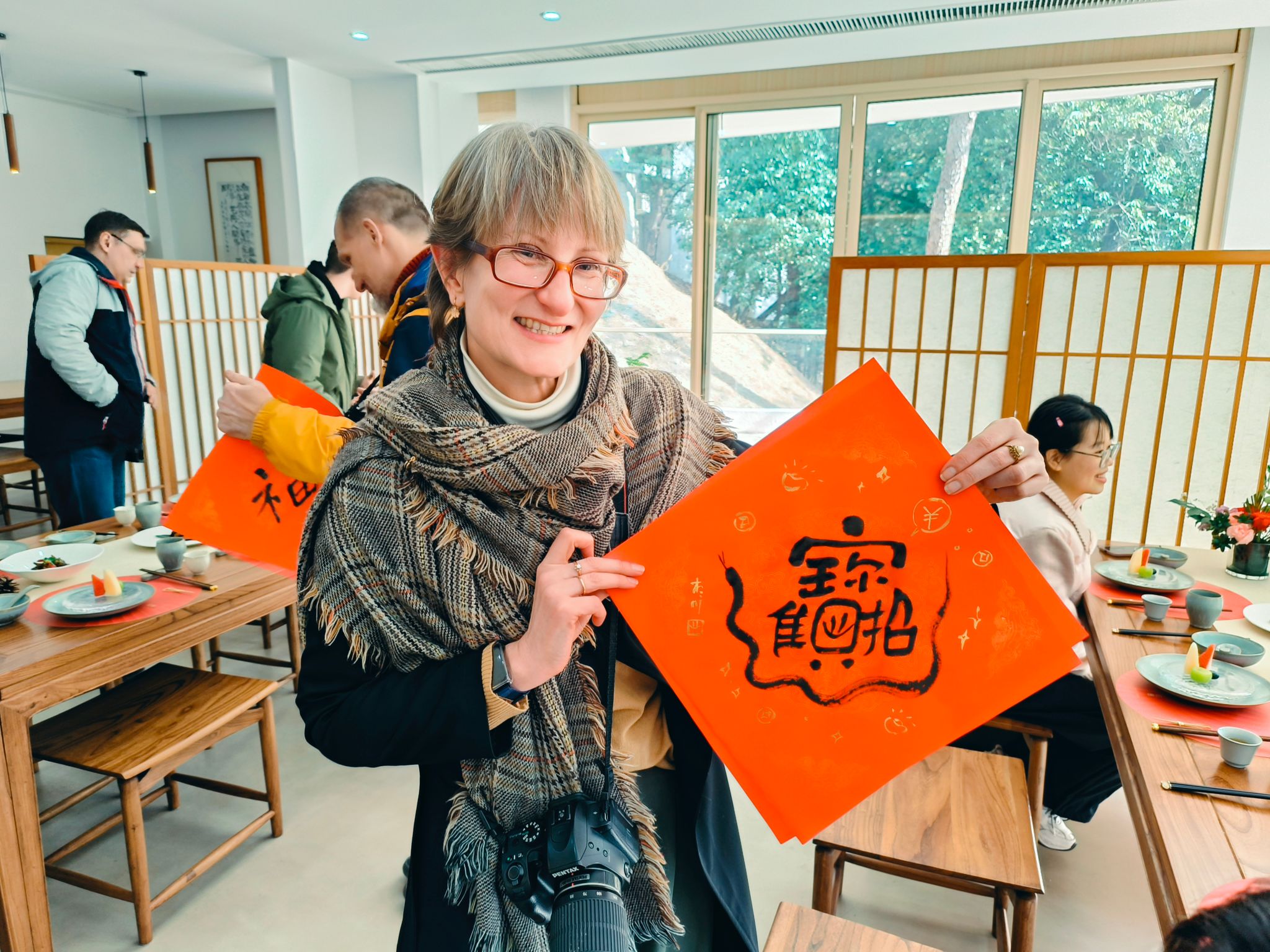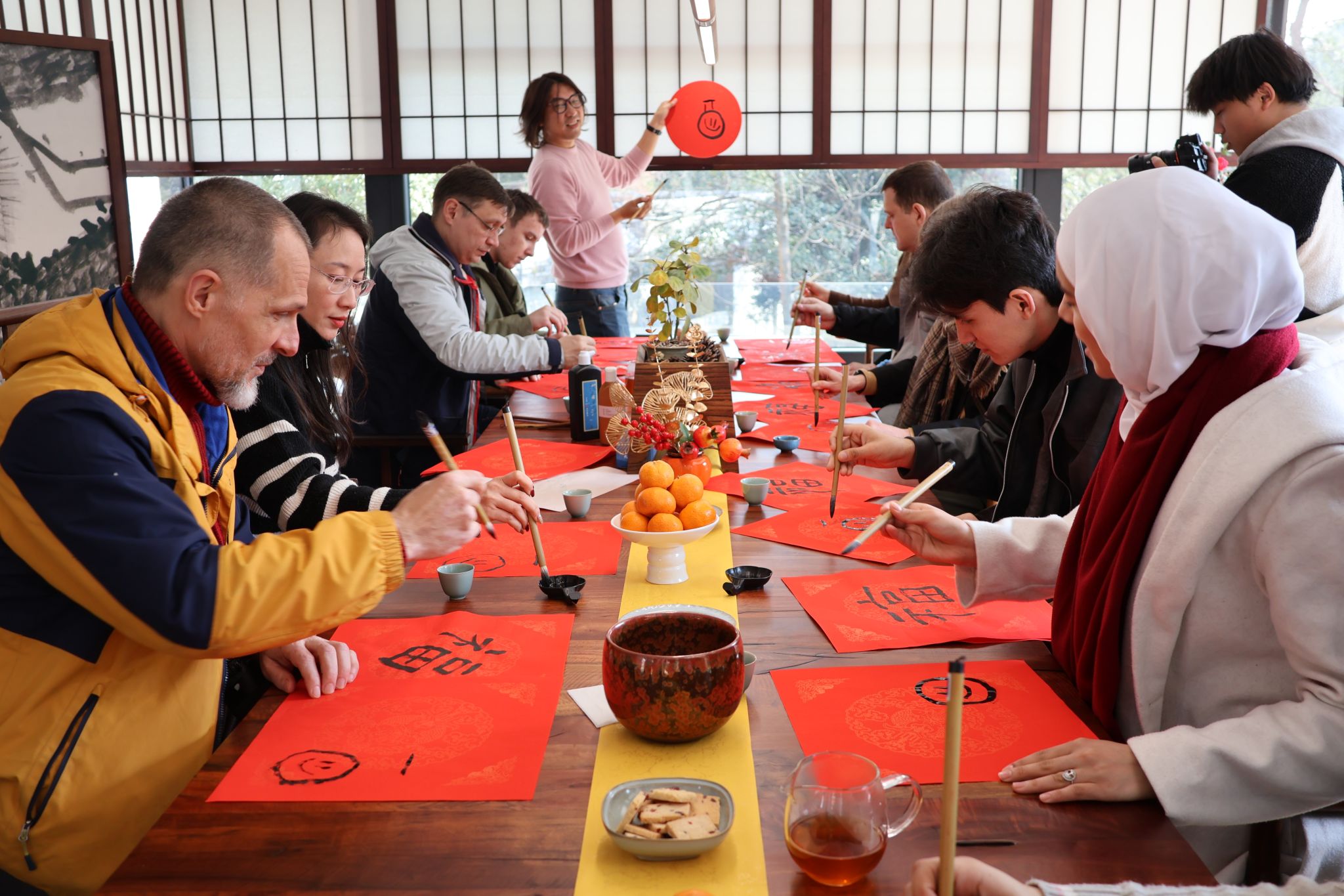 随后,外籍师生来到了松慈茶寮,“风来松涛起,日暖玉生烟。亭下众人聚,笔墨纸砚齐”。学校设计学院教师江彬为外籍师生详细讲解了中国书法的基本笔法和技巧,并亲自示范如何将中国书法与各国文字相结合。外籍师生拿起银毫、饱蘸墨汁,开始书写“门福”。尽管许多人是首次接触毛笔书法,握笔的姿势有些生疏,但都怀着极大的热情和认真的态度。一笔一划地临摹着江彬老师写的字样,然后画上笑脸、烟花、不同语言的新年祝福,再像盖印章一样署上自己的名字。英语、阿拉伯语、波兰语、乌克兰语等文字一同出现在代表中国文化的红纸上,中国的“福”字被注入新的生命力,彰显着中西文化交融的美感。