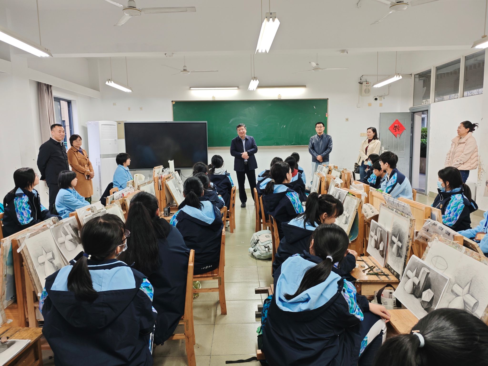 黄光杰一行来到宁波美术学校专业教室,看望正在上《素描》课程的学生。他首先感谢同学们对学校的认可,报考3+4中本一体化项目,希望同学们充分利用3+4中本联合培养优势,抓住机遇,坚持不懈,优化时间,做好职业和深造规划,通过七年的学习,文化基础更牢固、专业技术更扎实、特色特长更突出、价值提升更明显,打响中本一体化人才培养创新模式品牌。