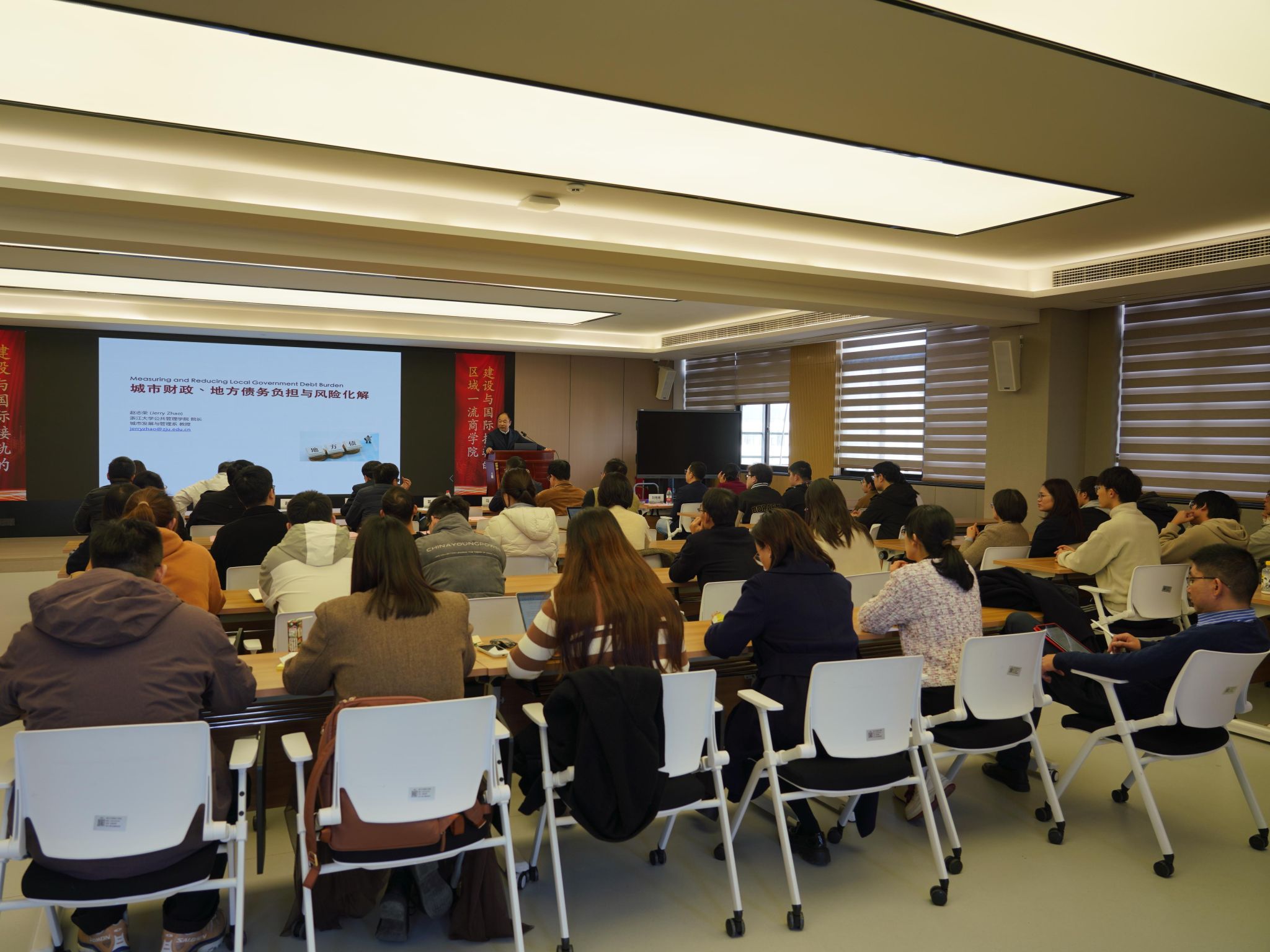 11月28日下午,浙大宁波理工学院明德大讲堂第四期在SC412举行,活动主题为“城市财政、地方债务负担与风险化解”。本次活动由浙大宁波理工学院商学院主办,特邀浙江大学公共管理学院院长赵志荣教授担任主讲人。浙大宁波理工学院党委副书记杨国富、浙大公管学院MPA中心副主任谭永忠等出席活动,百余名师生通过线下和线上直播的方式观看讲座。