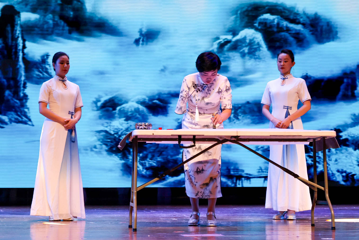 在表演中,中国书法家协会会员,“中国断臂左手书法第一人”许兆书,现场书写了一幅书法作品——浙大宁波理工学院校训“明德弘毅,开物启新”,赢得全场阵阵掌声。