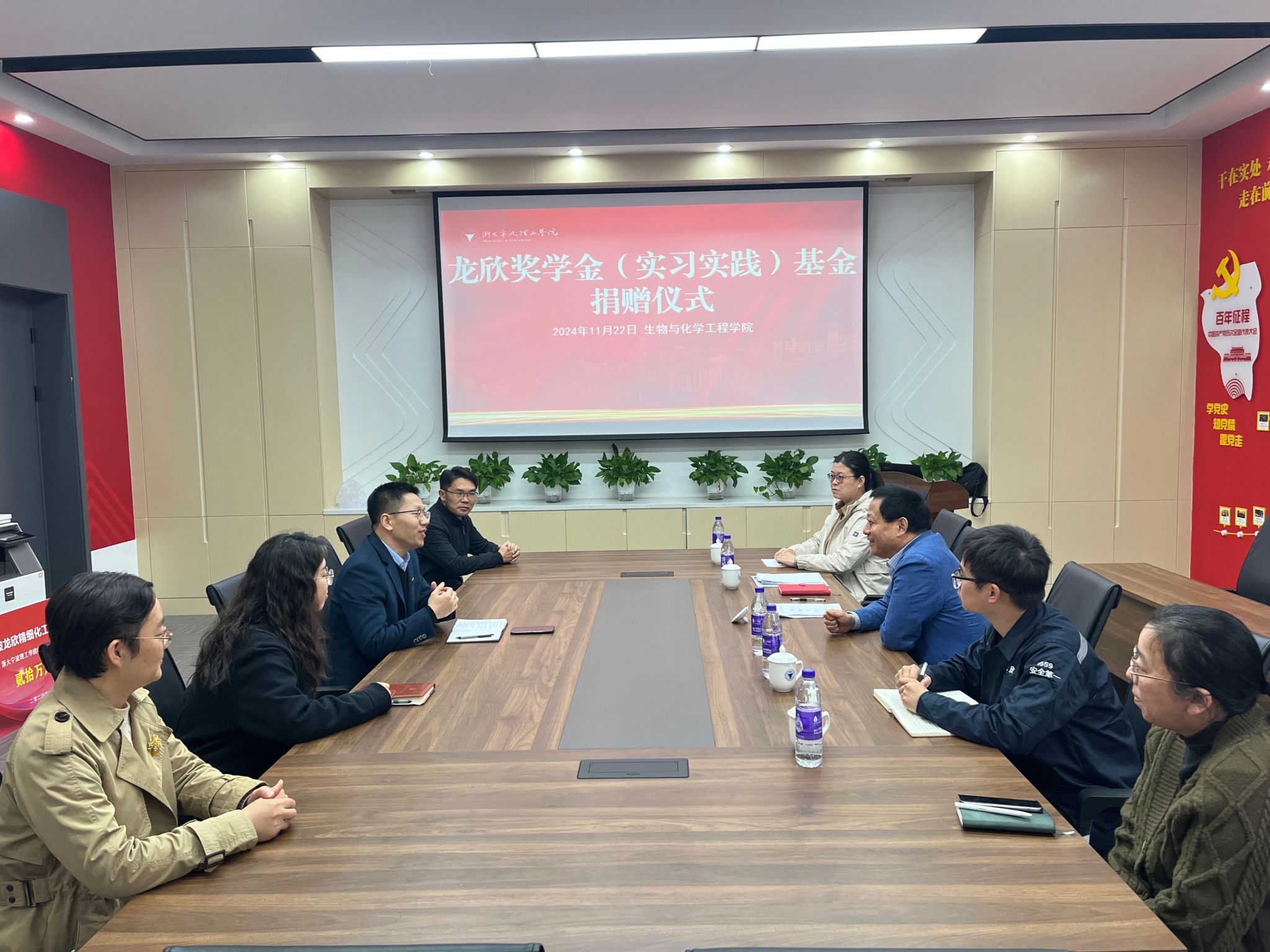 为进一步深化校企合作,加强产教融合、供需对接,更好地增强学生综合实践能力,全力推进生化学院毕业生高质量就业工作。11月22日,生化学院诚邀宁波龙欣精细化工有限公司董事长黄兆龙、办公室主任谷灿波等企业主要负责人来校调研交流,并举行“龙欣奖学金(实习实践)基金”捐赠授牌仪式。