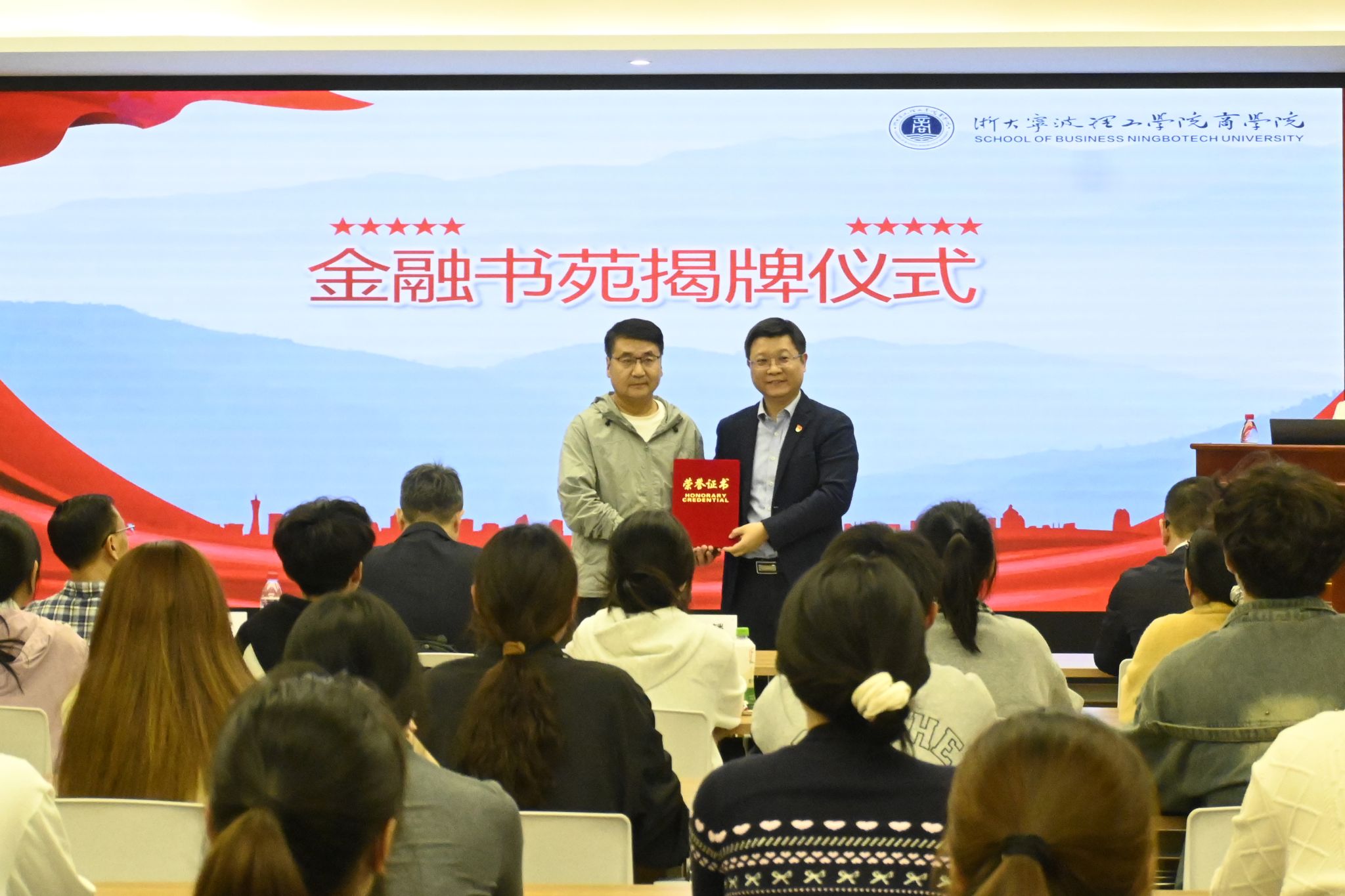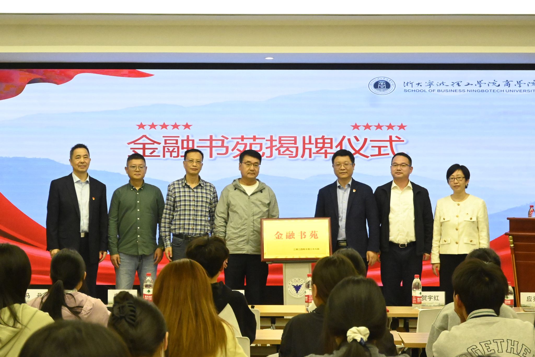 10月28日晚,金融书苑揭牌仪式在学校商学院举行,《宁波金融》主编肖成华、金融书苑捐赠人王珏麟、宁波市保险行业协会原副秘书长虞武定、原宁波市图书馆副馆长贺宇红等应邀出席,商学院相关负责人及师生代表参加仪式。