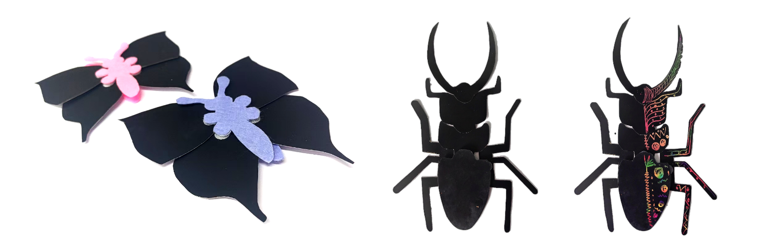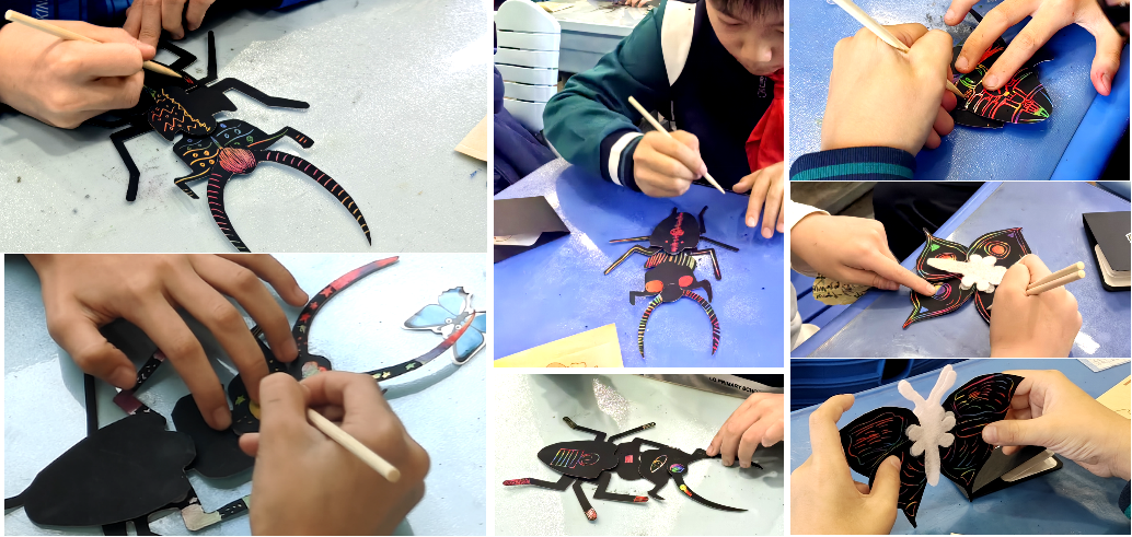 此外,国创团队还精心设计了“我的奇妙昆虫”手工拼接教具,将蝴蝶和锹甲的身体结构按照头、胸、腹三个部分进行拆分,让孩子们在了解昆虫身体结构的基础上,现场组装属于自己的奇妙昆虫。为了激发孩子们的创造力和想象力,团队特别选择了色彩鲜艳的刮刮画纸,让他们为自己的昆虫穿上漂亮的“花衣裳”。这一环节不仅让孩子们在创作过程中体验到了探索的乐趣,还将科普、娱乐、教育深融合,让孩子们在轻松愉快的氛围中学习昆虫知识,既调动了他们的兴趣点和创造力,也培养了他们的观察能力、动手能力和表达能力。