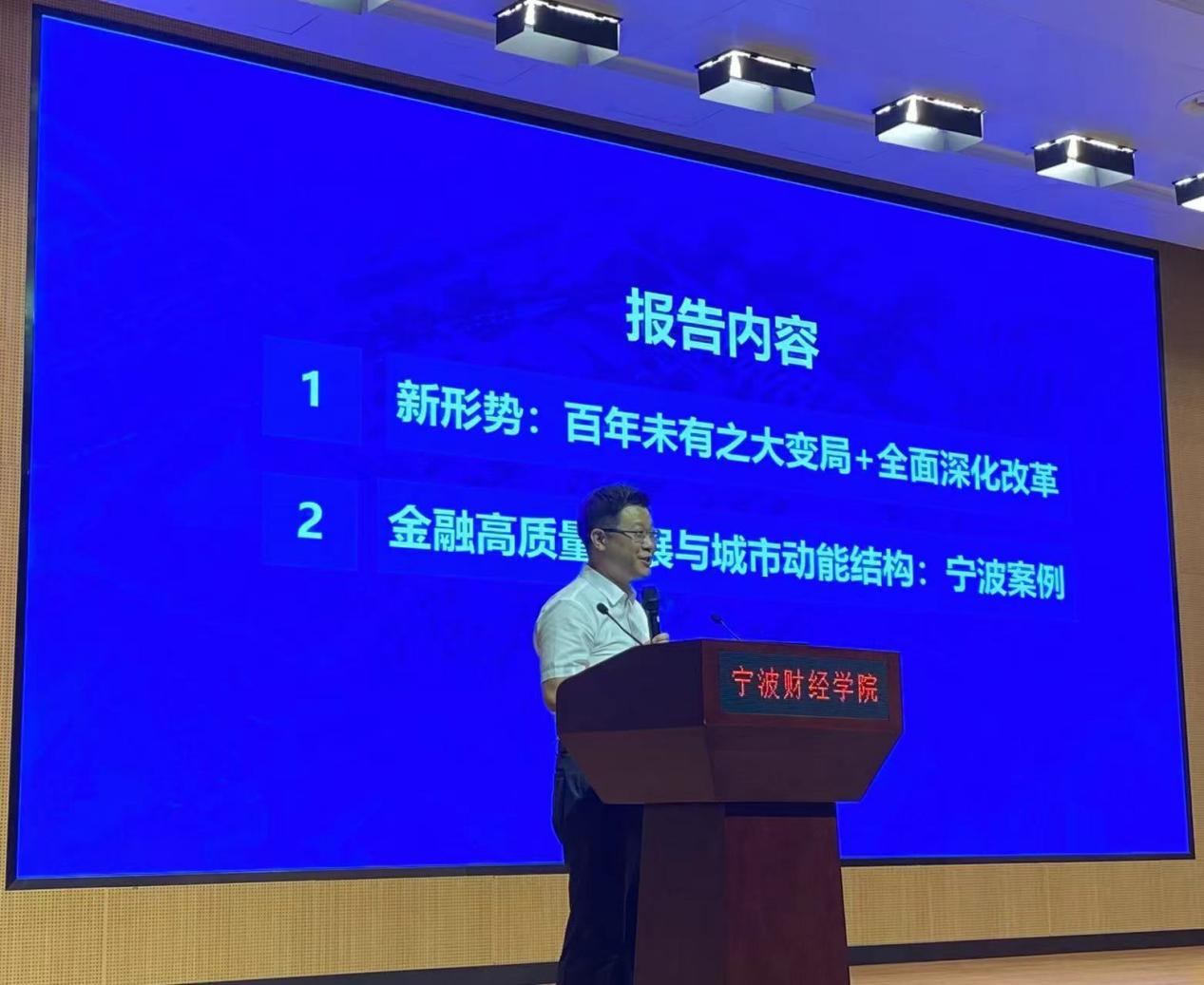 在会议的专题报告环节,马翔教授应邀进行了有关《新形势下金融业高质量发展与城市动能结构转换》的专题报告。在报告中,马翔教授分享了新形势下金融业全面深化改革的趋势与方向,并结合宁波案例,深入探讨了推动金融高质量发展与促进城市动能结构转换的可行性路径与机制。