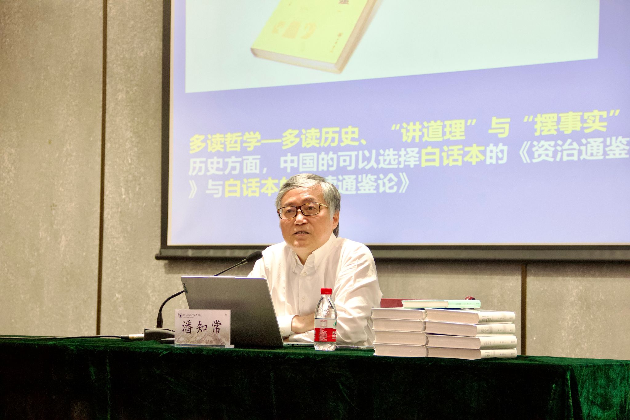 在讲座过程中,潘教授循循善诱,寓教于乐,以“我学习王阳明的体会”为主题,带领同学们走入了一个奇妙的哲学世界。潘教授首先从哲学、历史的角度切入,表明学习这两门学科能够告诉大家如何正确的讲道理、摆事实,它是我们为人处事的一门重要课程,并由此概括出阳明心学不仅是哲学的生命,也是生命的哲学。