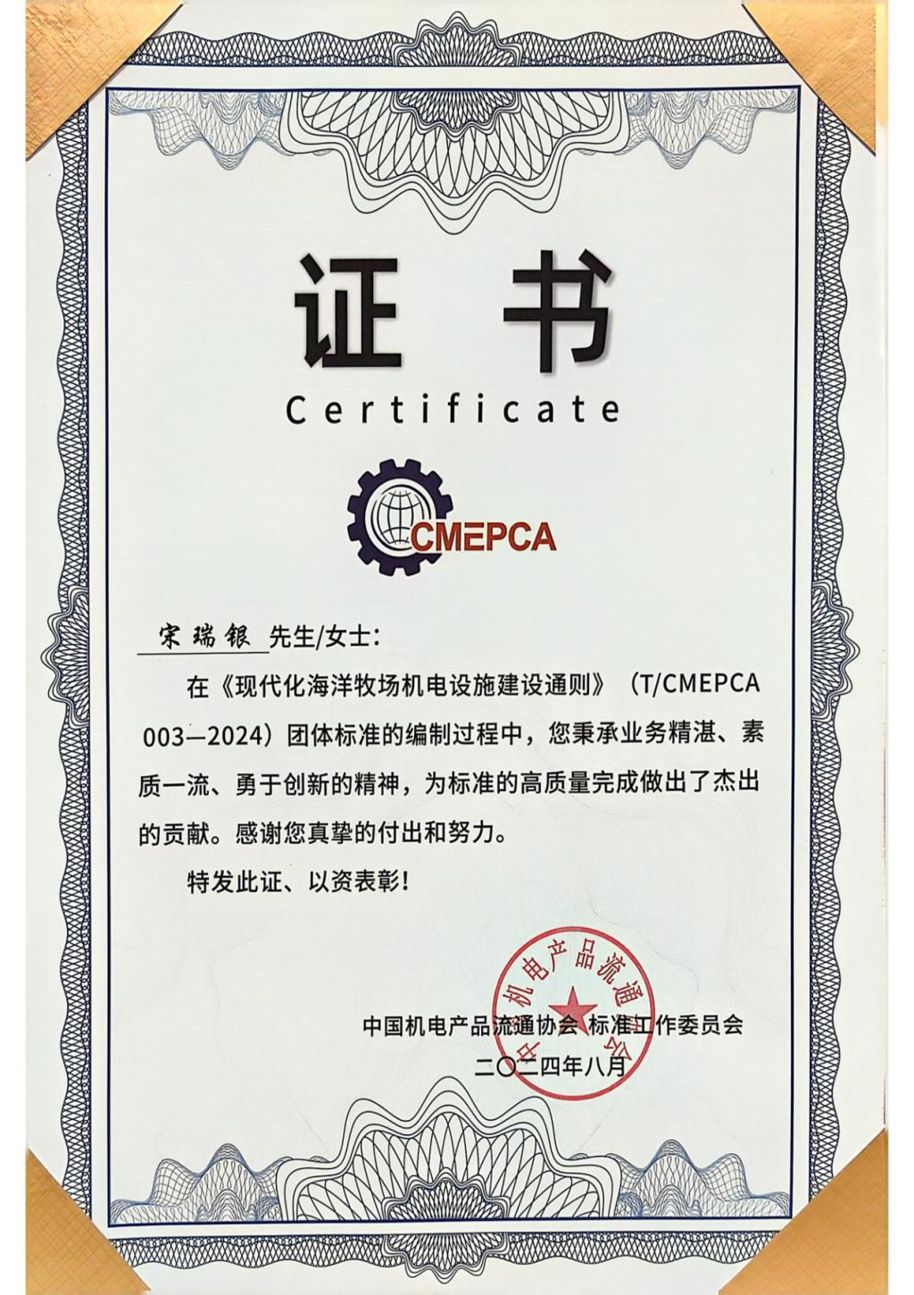 此外,团队主编并完成了《现代化海洋牧场机电设施建设通则》(T/CMEPCA003-2024)团体标准的编制工作,我校为第一完成单位。