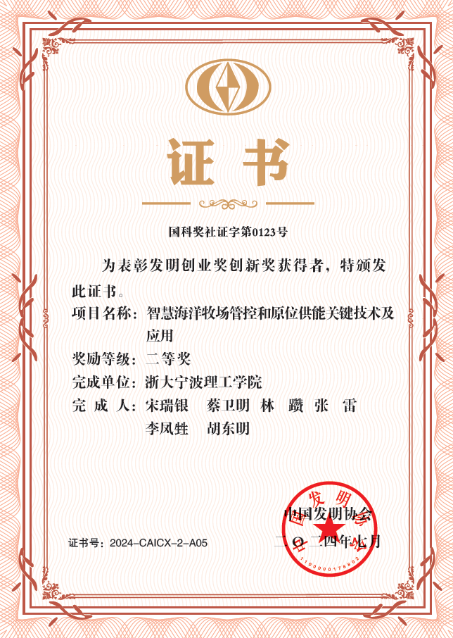 我校作为第一完成单位、机能学院宋瑞银教授作为第一完成人的“智慧海洋牧场管控和原位供能关键技术及应用”成果获得中国发明协会颁发的发明创业奖创新奖二等奖。该奖项是2005年经科技部批准,中国发明协会设立,国家科技奖励办公室注册的社会力量设奖,其中创新奖具备提名、推荐国家科学技术奖资格。