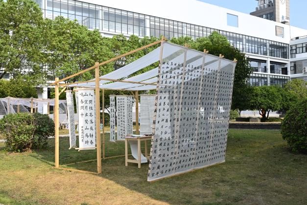 “墨方”是建筑学与书法社合作的成果。设计旨在为书画作品提供一个适宜的展览空间,确保作品的可见性和保护性。装置的设计与书画作品相得益彰,创造一个和谐、吸引人的视觉环境。本作品集观赏性和互动性于一体,以正方形为主体的外环,内置一张书法桌,注入互动元素,观赏者可在内作画,外动内静,增添空间趣味性。三面展示书法作品,制造出卷轴的效果。上方通过斜木杆支撑,白纱布迎风遮盖,制造光影效果的同时,对内部空间进行一定的自然保护。