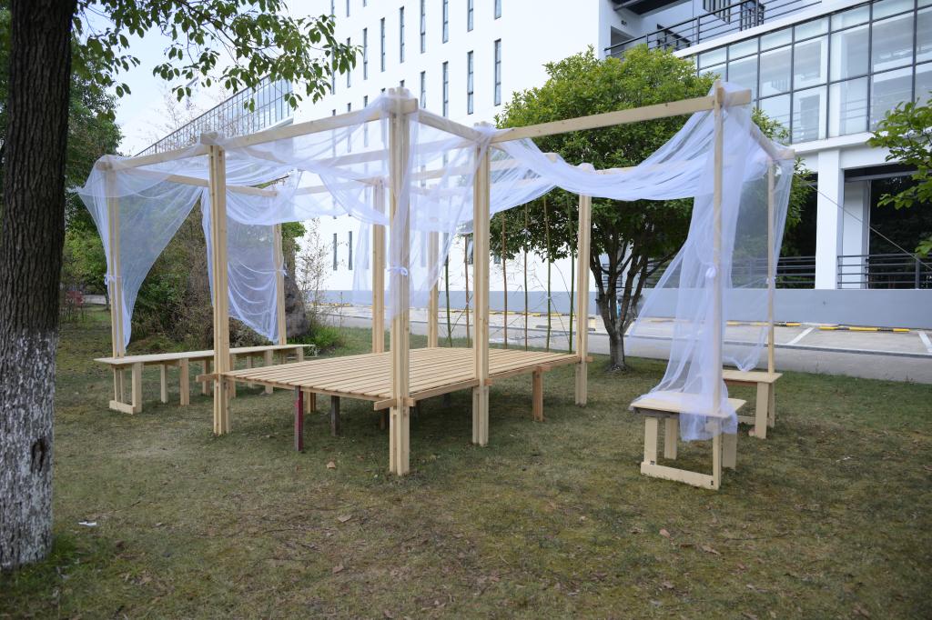 “序列静息”意为一个有秩序的休憩场所,搭建的场地位于校园竺园内,设计之初的灵感来源于自行车辐条,旨在运用有秩序的木条交错对现有的室外空间进行干预,达到激活竺园闲置空间的效果。作品提倡一种无意识的社交概念,因此孵化了一个这样的交流平台,同时得益于结构上的设计,交流平台也可以是骑行的驿站,开放式的空间内设有座椅,为来往的陌生人提供一个联系的纽带,天然木材融入自然的环境中,为校园提供了一个独特的交流互动空间。