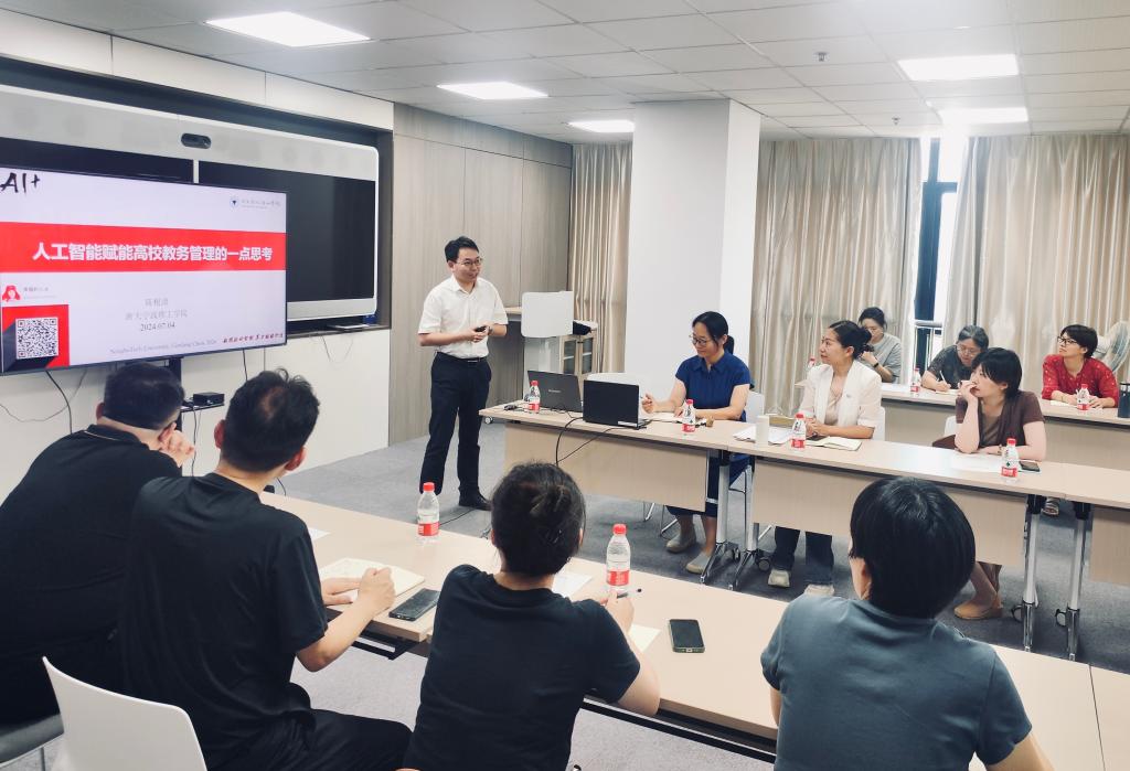 7月4日上午,2024年第5期教务读书会以“人工智能赋能教学教务管理工作”为主题,在行政楼504会议室召开。副校长张荣祥出席会议。读书会邀请了计算机与数据工程学院院长陈根浪教授做专题报告,各学院教务员以及教务处全体人员参加学习。