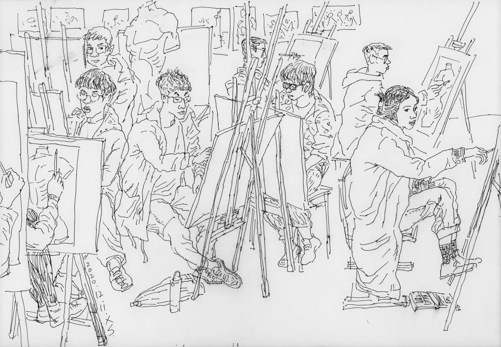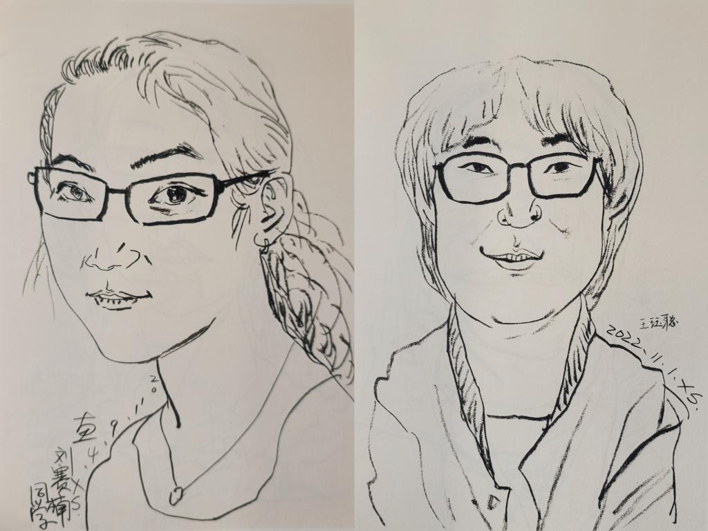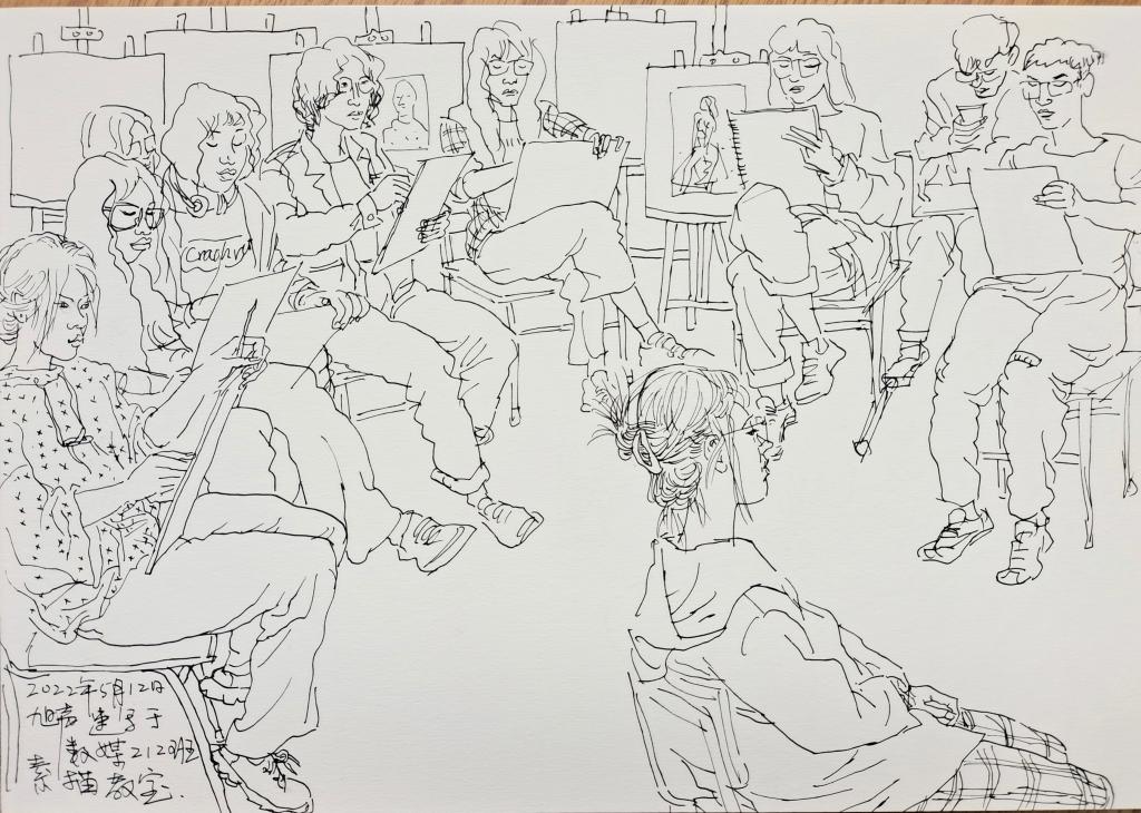 由旭声老师利用课堂内外的时间,采用速写的形式,生动描绘了学生在课堂上、写生中的形象、动作、神态,画面活灵活现、栩栩如生。由老师为了夯实学生大三漫画创作基础,在素描课上为学生们安排了略带夸张变形的头像速写,同学们轮流做模特儿,绘画兴趣倍增,课堂氛围活跃,教学效果明显提高。由老师也随着学生们用轻松愉快的头像速写为学生们留下了珍贵的作品。