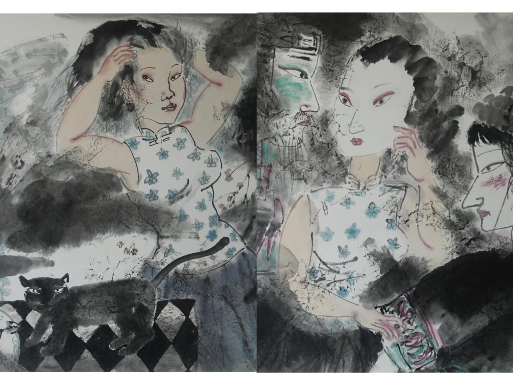 80年代后期开始,由旭声老师应邀为《读者文摘》(现为《读者》)画插画。插画很考验艺术家的速写功底,需要紧扣文章中描绘的人物动态、形象特征和环境场景等要素,用速写的方式一一表达出来。我们熟知的《唐纳德的梦》便是其中的一幅作品。《唐纳德的梦》讲述的是一个工人,妻子是佣人,但他希望自己的女儿都能当博士。当时的创作情景由老师还记忆犹新,他看过几遍后,脑海里便有了纷乱的画面,更多浮现的形象却是走来走去的企鹅,这些憨憨笨笨的形象,是当时正在热播的电视片《动物世界》里的片头场景,他感觉正和文中他想画的几个孩子的形象相吻合,于是铺纸蘸墨,放笔直取,一张画便很顺手地完成了,后来这幅插画参加了1989年的“第七届全国美术作品展览插画展览”。