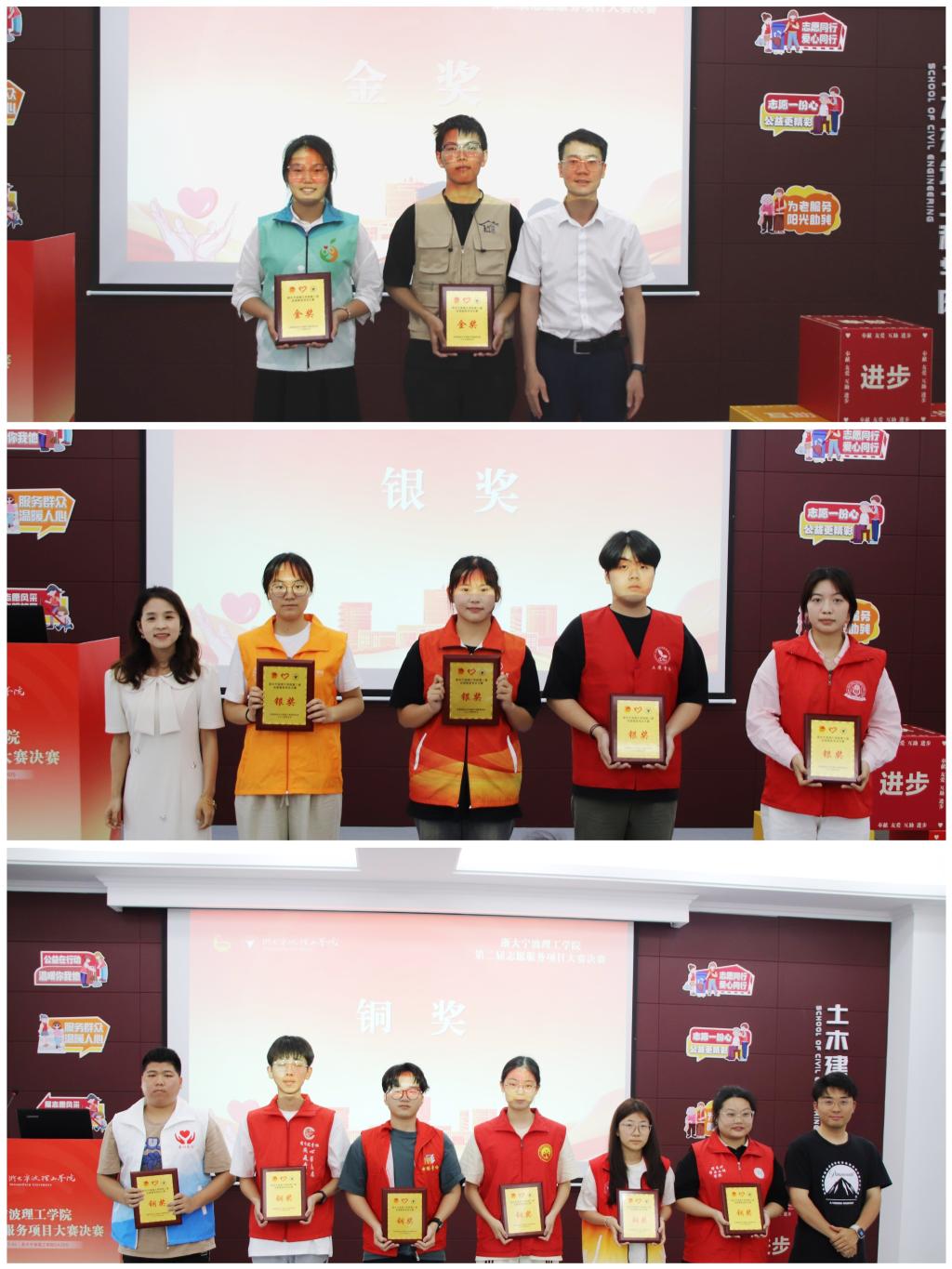 经评比,学工部“Light.反霸联盟”青少年健康成长的守护者项目、传法学院“浙礼文化,丰润民心”文化礼堂引领乡村精神共富志愿服务项目获金奖,土建学院初心“‘童’行”新时代雷锋精神践行项目等4个项目获银奖,商学院“敬老孝老——推进养老服务,构建颐养之家”志愿服务项目等6个项目获银奖。