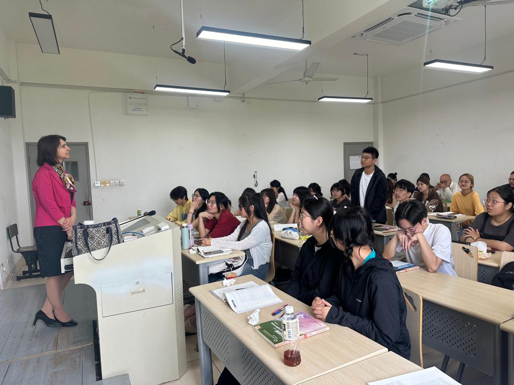 之后,赞科娃副教授做了“中国传统文化与保加利亚文化中的‘天’与‘地’概念”的主题讲座,她引用了大量中文经典成语词汇,并将中国传统文化与保加利亚相关文化做了对比分析,讲解深入浅出,生动有趣。学生们在此次讲座中学习到了不同视角的文化概念,产生了浓厚的兴趣,与赞科娃副教授展开了热烈的讨论和交流。
