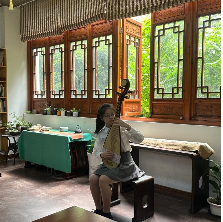 随后,他们参观了宁波市阳明文化创造性转化与传播基地。学生讲解员对阳明学堂进行了详细生动的介绍,并演奏了一段琵琶乐曲,受到了在场专家的连连称赞。