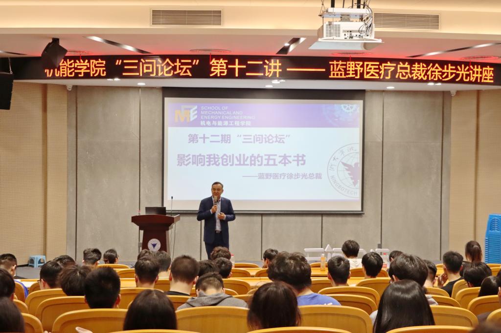 为了加强学生的创新创业能力和职业规划能力,营造书香校园,我校机能学院于4月29日在启新大讲堂举办“三问论坛”第十二讲,邀请国家万人计划专家、浙江省万人计划专家、宁波市特优人才、宁波蓝野医疗器械有限公司总裁徐步光作《影响我创业的五本书》主题报告。