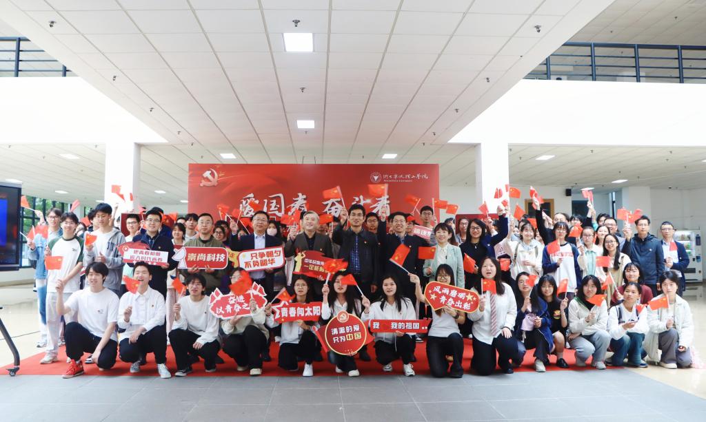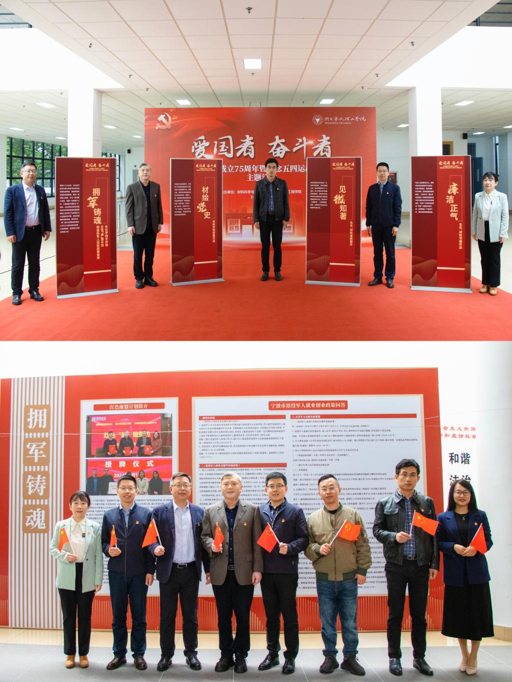 为深入学习贯彻党的二十大精神,庆祝中华人民共和国成立75周年,纪念“五四”运动105周年,展现中华民族伟大复兴进程中的奋斗故事,传承五四精神,激昂青春力量。4月28日中午,生化学院、材料学院联合在NC大厅举办了“爱国者 奋斗者”爱国主义教育活动开幕式。宁波市退役军人服务中心主任乐铁峰,学校团委、材料学院、生化学院相关负责人,师生党员、共青团员近100人参加活动。