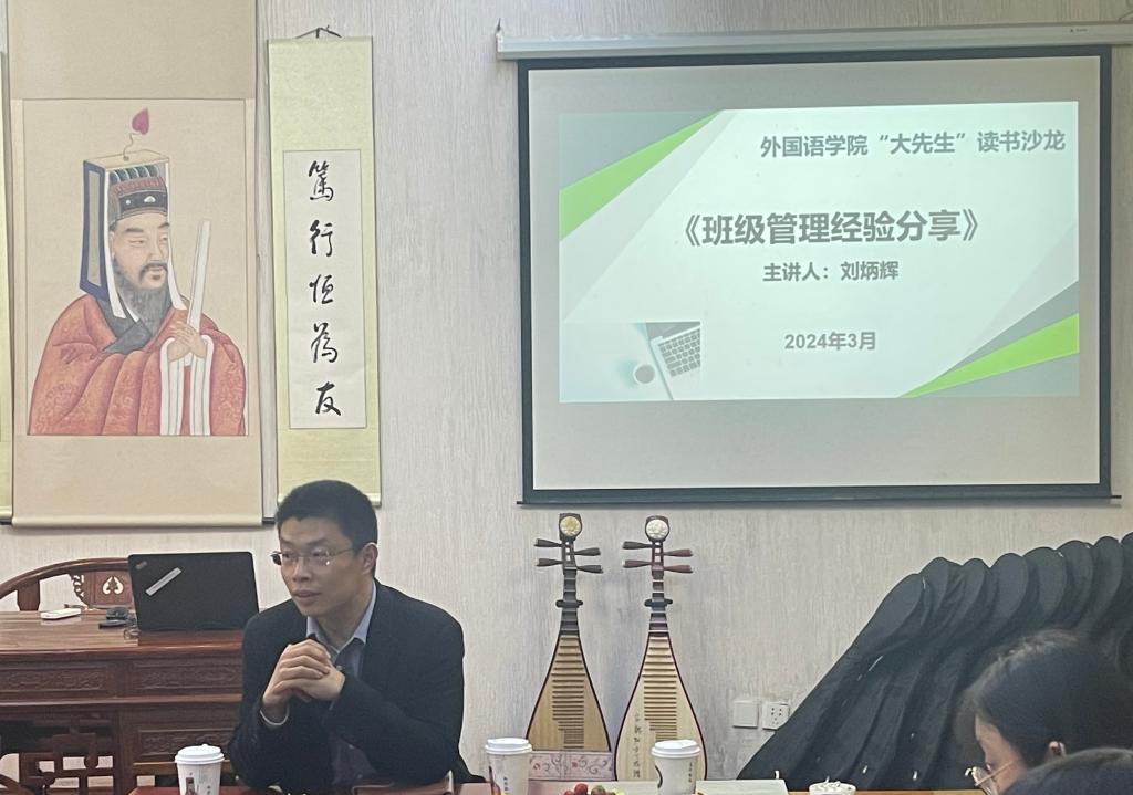 3月19日下午,外国语学院新学期“大先生”读书沙龙在阳明学堂举行。本期沙龙围绕班级建设管理经验开展,特邀学校马克思主义学院副院长、院聘教授刘炳辉博士主讲,外国语学院相关负责人、班导师、辅导员参加了活动。