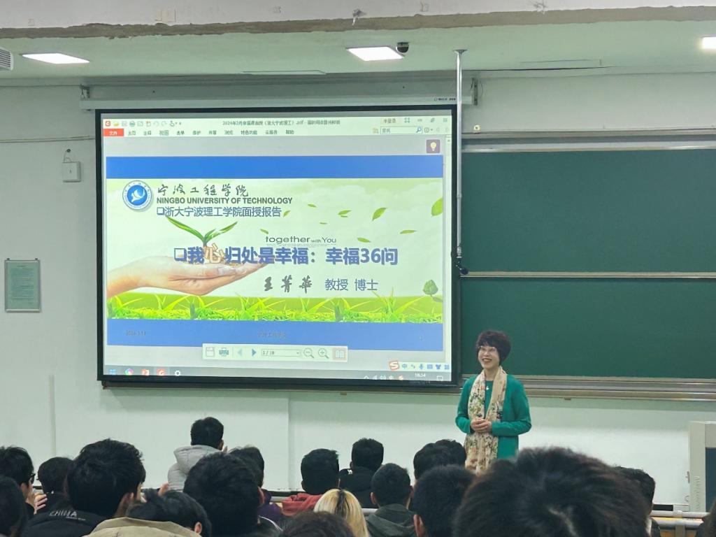 为贯彻“以学生发展为中心”的理念,培养学生探索人生意义和体悟美好生活的能力,营造健康、阳光、积极向上的校园氛围,3月14日,由我校沈昊宇教授和宁波工程学院王菁华教授团队精心策划并联合推出的通识选修课《我心归处是幸福:幸福36问》在SC216室开讲,这是我校首次开设的“浙大宁理幸福课”。该门课程的开设旨在将心理教育、专业教育、通识教育相融合,以线上线下相结合的方式,帮助学生树立正确的幸福观,让学生在学习中体验幸福,在生活中找寻幸福。
