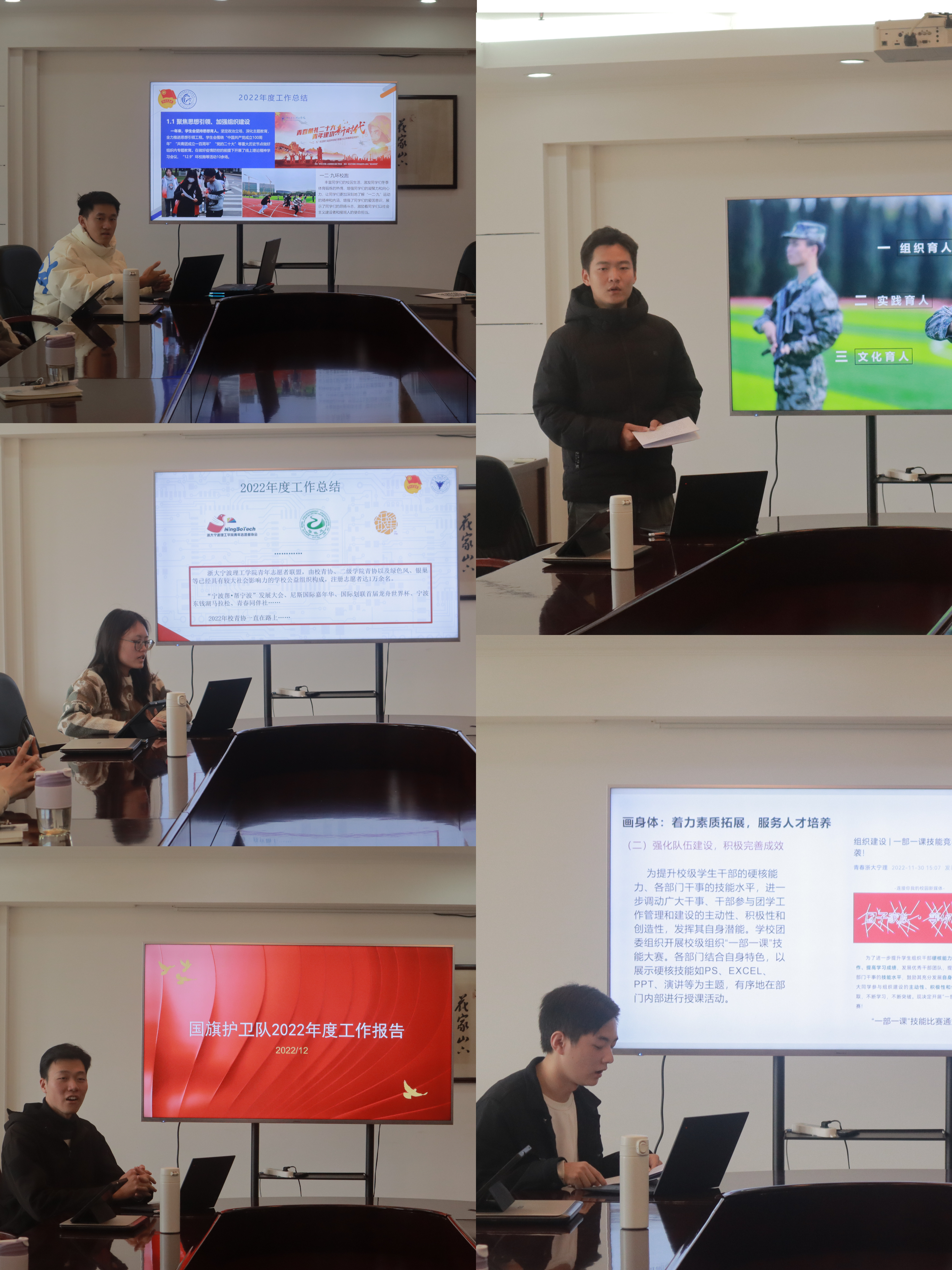 团委以“燃梦青春,奋以前行”为主题,从工作实绩与总结、存在的问题分析、下一年工作重点三个方面汇报了本年度校团委工作总结,下一阶段将多渠道强化青年思想学习,全方位服务青年成才发展,加强团的基层组织建设等内容,争取建设更具有引领性和感染力的学生组织。学生会主要从工作总结、存在不足和2023年工作计划三方面展开汇报,2023年学生会将找差距、补短板,继续做好创新工作,推出“形式新颖、内容丰富”的活动,不断提高服务成效。校青协2022学年在学校团委的带领下,稳步推进各项志愿服务工作,创新志愿服务方式,打造品牌化志愿项目,并将继续秉持“奉献、友爱、互助、进步”的志愿服务理念,提高学校志愿服务水平,营造志愿服务良好氛围。国旗护卫队从日常工作情况、开展的活动情况、组织框架做了简要汇报,强调了骨干队员的带头作用,每一名成员将继续恪尽职守,认真做好本分工作,贡献自己的青春力量!军协从组织育人、实践育人、文化育人三大板块,“比”起来的作风建设、“学”起来的组织培训、“赶”起来的技能水平、“帮”起来的学业能力、“超”起来的工作标准五大内容对本学年工作进行了总结。在新一年中,将继续提高队伍建设水平,让越来越多的人能够加入军协队伍,感受迷彩生活!