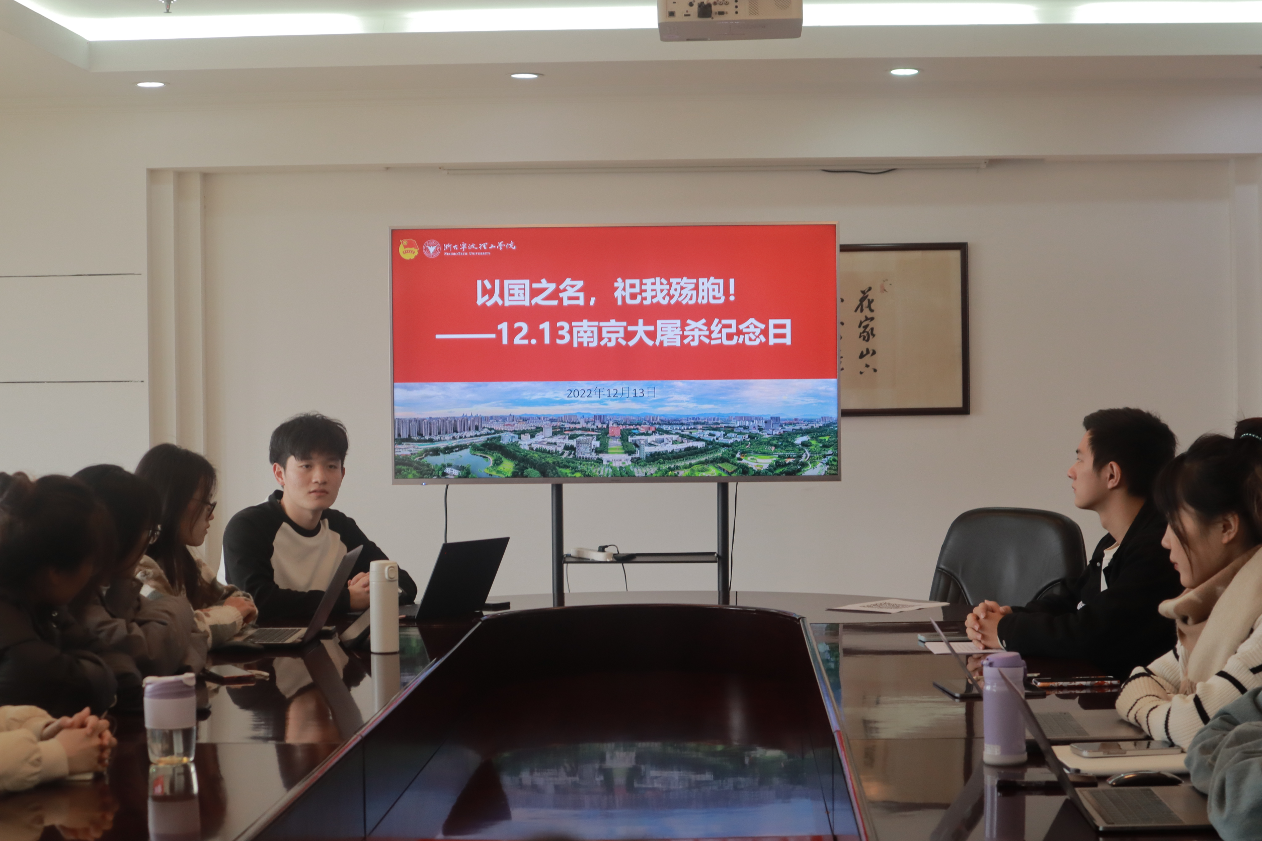 孟浩栋领学“以国之名,祀我殇胞”——国家公祭日主题教育。通过讲解国家公祭日来源、中国军民奋力抗击侵略并取得伟大胜利等历史知识,让大家进一步了解南京大屠杀的背景以及设立南京大屠杀死难者国家公祭日的意义。随后观看“南京大屠杀”有关视频,视频中的惨痛历史震撼着在座同志们的内心,一个个铁证如山的罪证,一幅幅惨绝人寰的画面引发了在场同学情感上的共鸣,警示大家要“铭记历史,不忘国耻”。