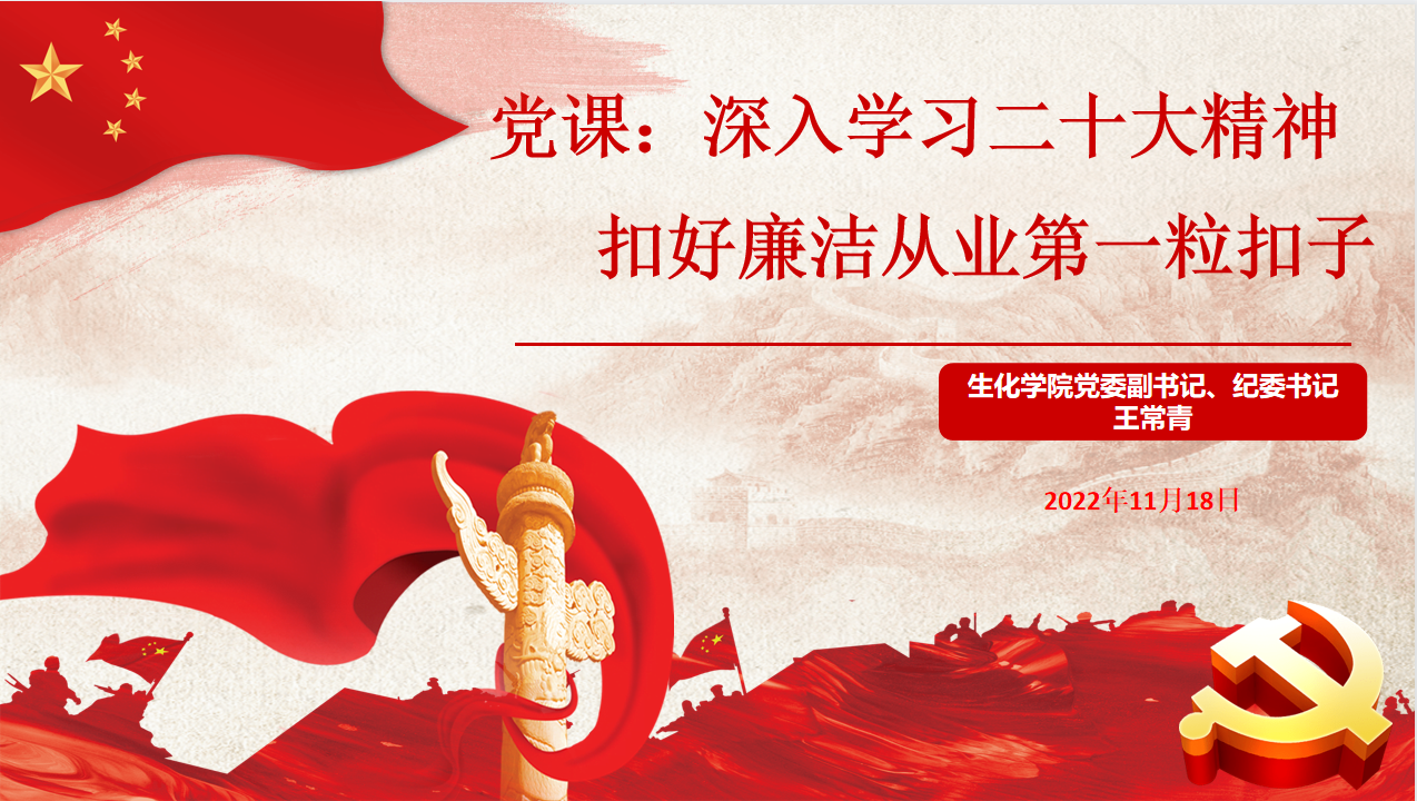 11月18日,生化学院在NC102开展“深入学习党的二十大精神,扣好廉洁从业第一粒扣子”学习会。学院教务办、学工办老师及19级学生参加了此次学习活动。党课由学院党委副书记、纪委书记王常青主讲。