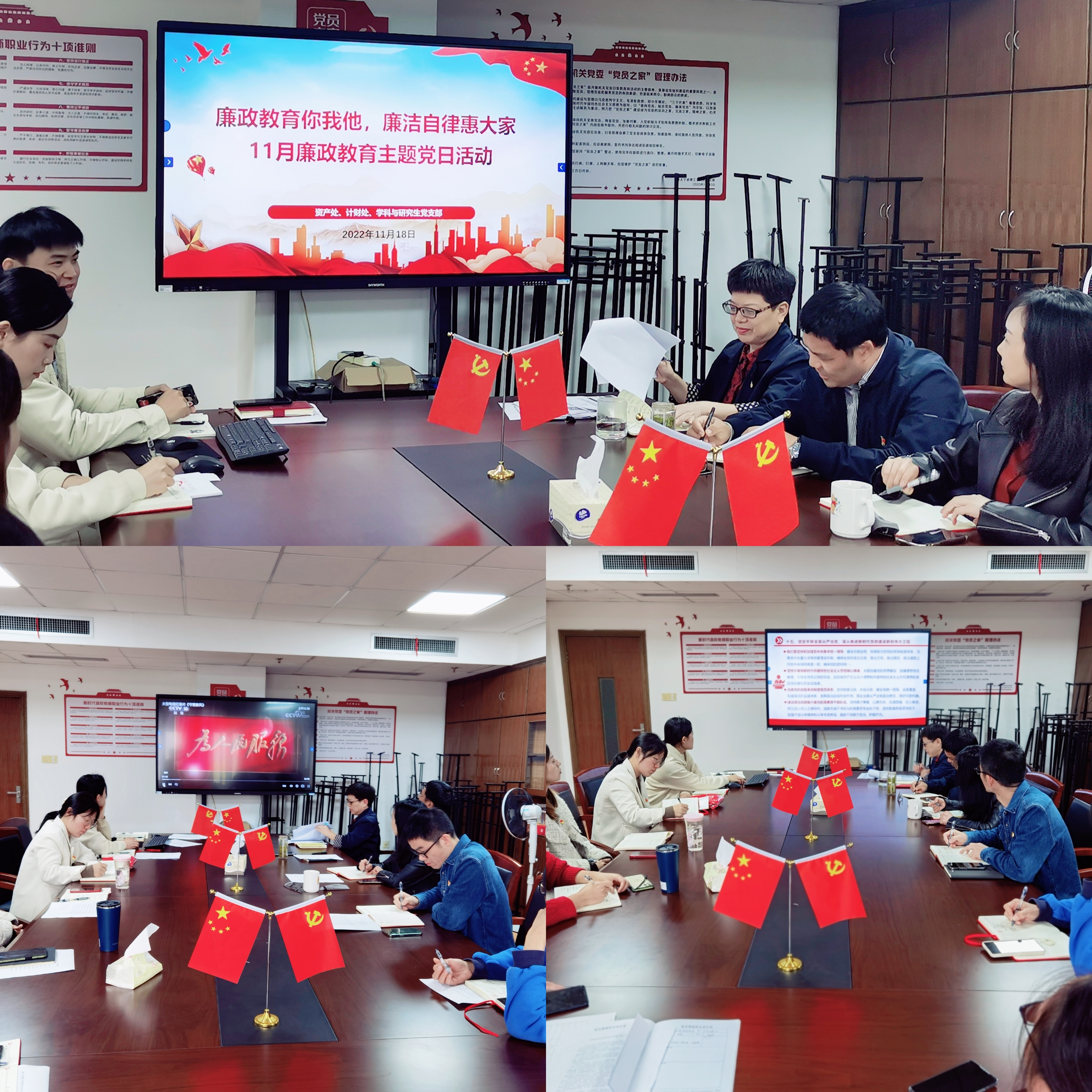 为做好党员廉政教育,加强党的二十大精神中全面从严治党的理论学习,巩固和加强党员廉洁教育成果,激励广大党员廉洁自律品性养成。结合学校机关党委党建工作要求和廉洁教育工作部署。11月18日,资产处、计财处、学科与研究生党支部全体党员在行政楼410组织开展廉政教育主题党日活动,活动由资产处党支部副书记赵昌志主持。