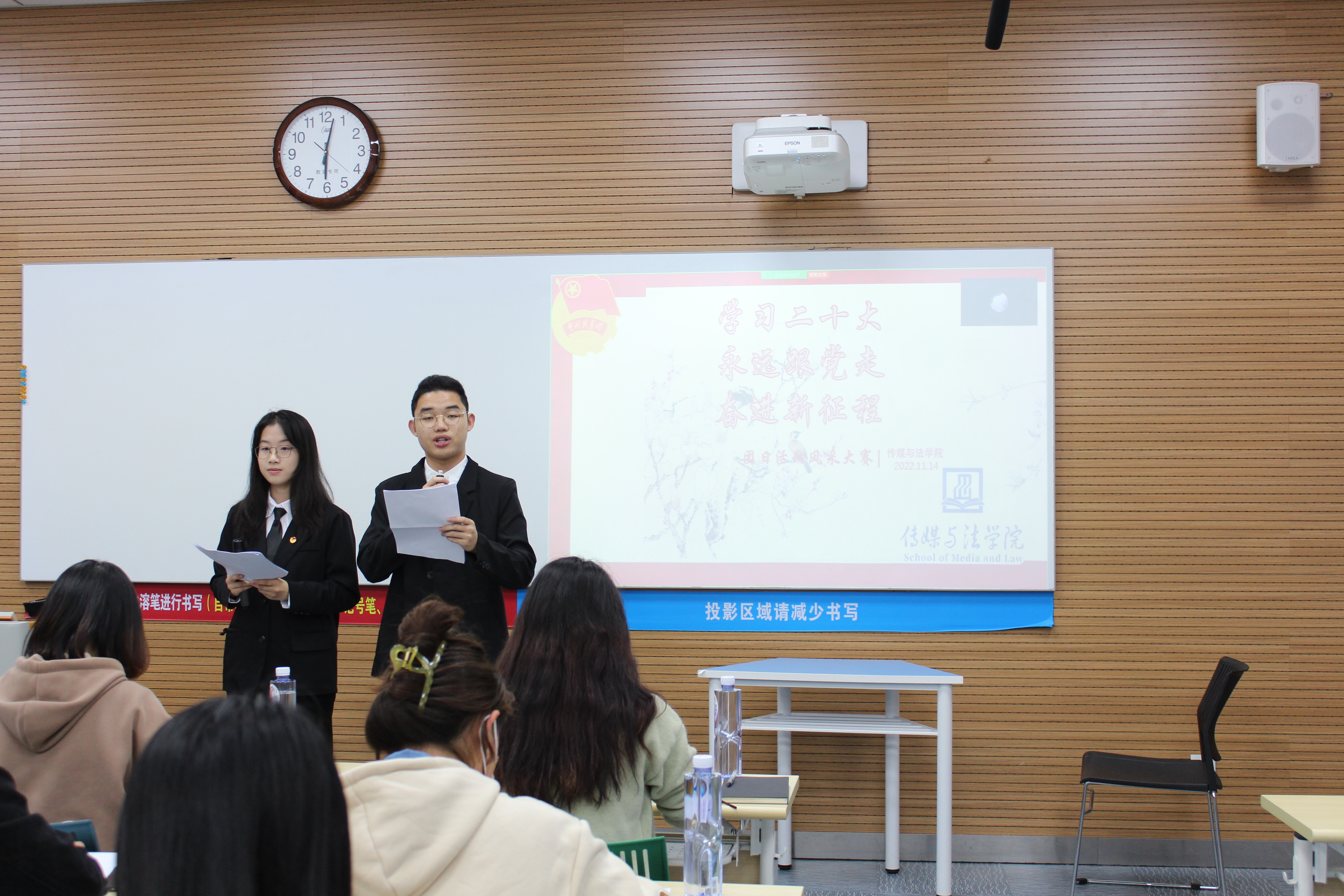 为深入学习贯彻党的二十大精神,集中体现学院团员青年风貌,展现各班级的团日活动特色。11月14日晚,传媒与法学院于NB108开展“学习党的二十大、永远跟党走、奋进新征程”主题团日活动风采大赛。学院团委书记李倩倩、团委副书记鲁晓玲、团委主席团代表等担任本次比赛评委。