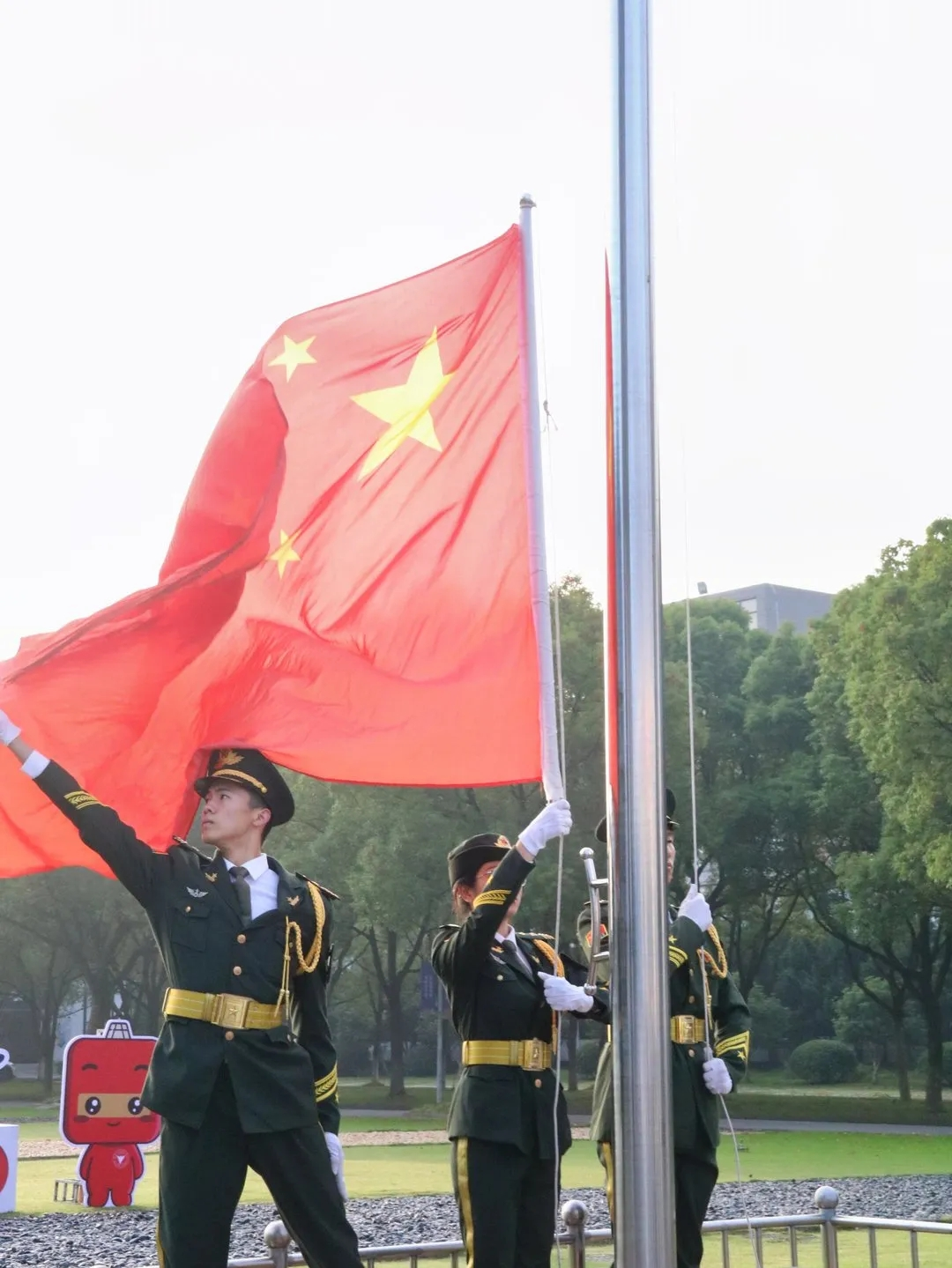 随着《义勇军进行曲》的奏响,升旗仪式开始。全体师生整齐肃立,高唱国歌,鲜艳的五星红旗在全体人员的注目下冉冉升起,随风飘扬。