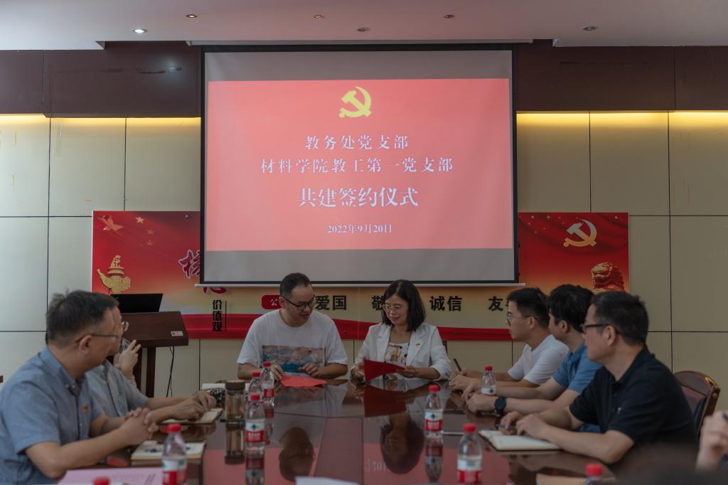 为深入学习贯彻习近平新时代中国特色社会主义思想,不断加强基层党组织和党员队伍建设,以党建推动教育教学发展,不断增强党支部凝聚力和战斗力,教务处党支部与材料学院教工第一党支部共建签约仪式于9月20日举行。